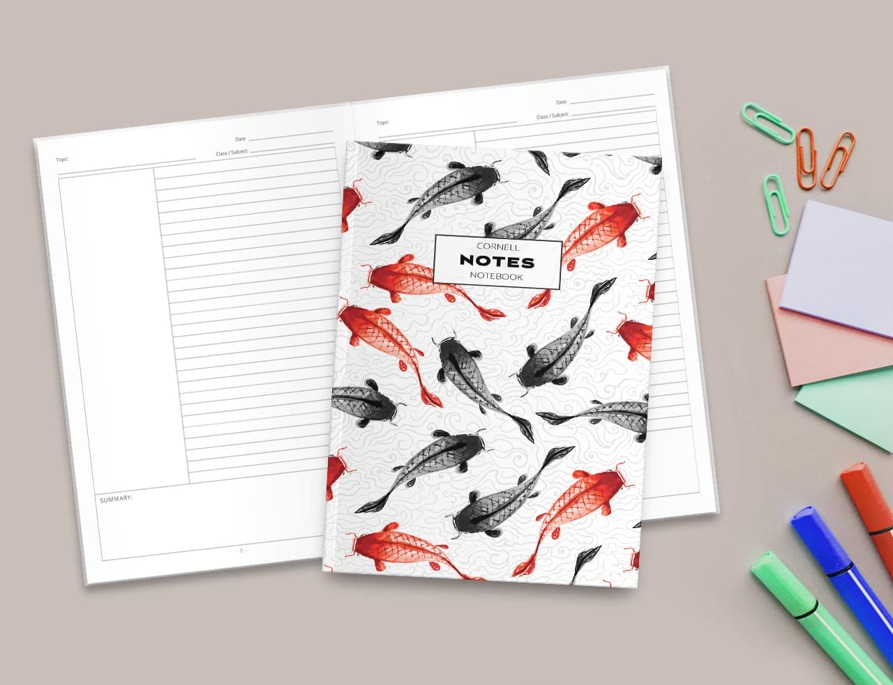 Cornell Notes Notebook: Note Taking with College Ruled Lines, Index and Numbered Pages, Koi