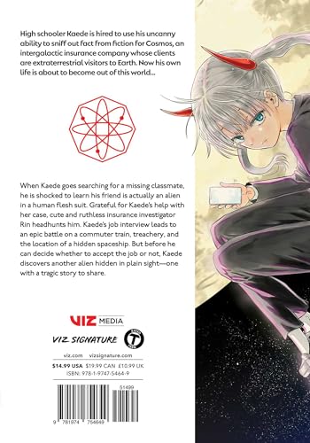High school student Kaede’s new job is out of this world–or at least his clients are… When high school student Kaede is hired to use his uncanny ability to sniff out fact from fiction for Cosmos, an intergalactic insurance agency, he embarks on a journey that is out of this world! Kaede’s search for a missing classmate leads to the shocking discovery that his friend is actually an alien in a human flesh suit. Grateful for Kaede’s help with her case, cute and ruthless insurance investigator Rin headhunts him. Kaede’s job interview leads to an epic battle on a commuter train, alien treachery, and a hidden spaceship. But before he can decide whether to accept the position or not, Kaede discovers another alien hidden in plain sight–one with a tragic story to share.