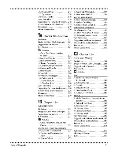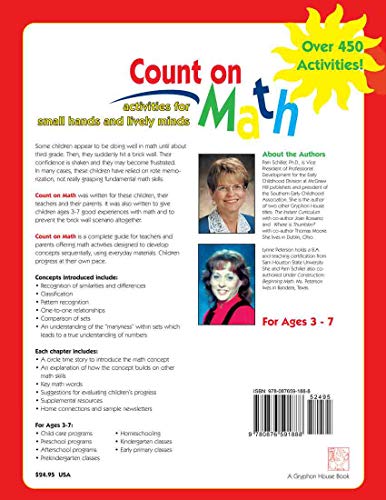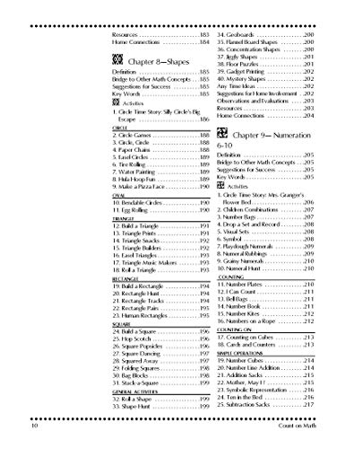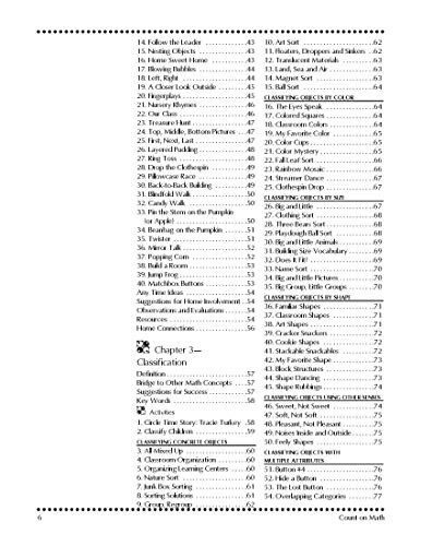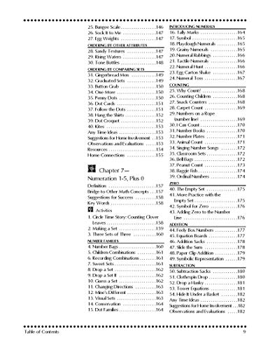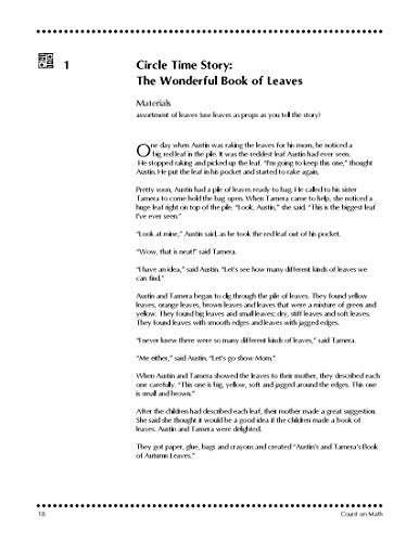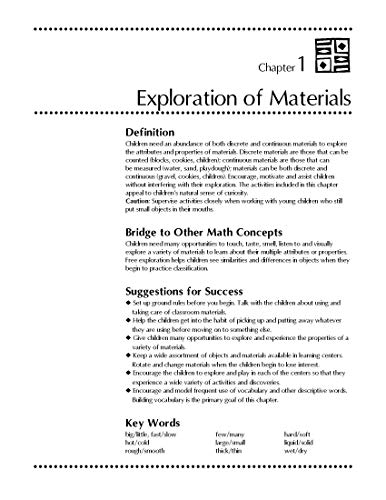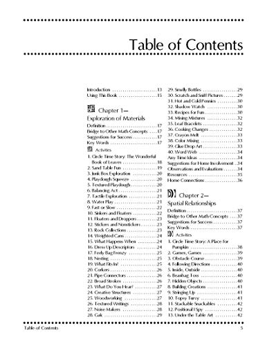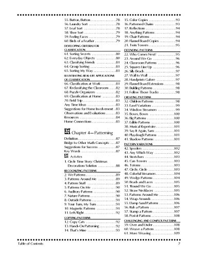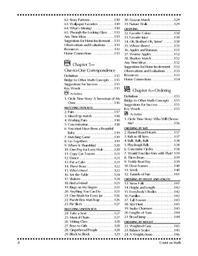 The activities in this book reflect children’s real world math experiences–counting candles on a birthday cake, sorting and classifying toys, making sure there is a one-to-one correspondence between children and cookies. Children learn spatial relationships, patterning, shapes, numeration, and many other math concepts from these simple activities, such as “Nature Sort,” “Human Rectangles” and “Stackable Snackables.” Each chapted of this invaluable resource presents a new math concept in developmental sequence, and the activities in each chapter build on what the children have already learned. Unique features in every chapter include an introductory story, intriguing activities, evaluation criteria, and a newsletter to send home to parents. Each math concept is introduced with a story and ends with suggestions for home connections.