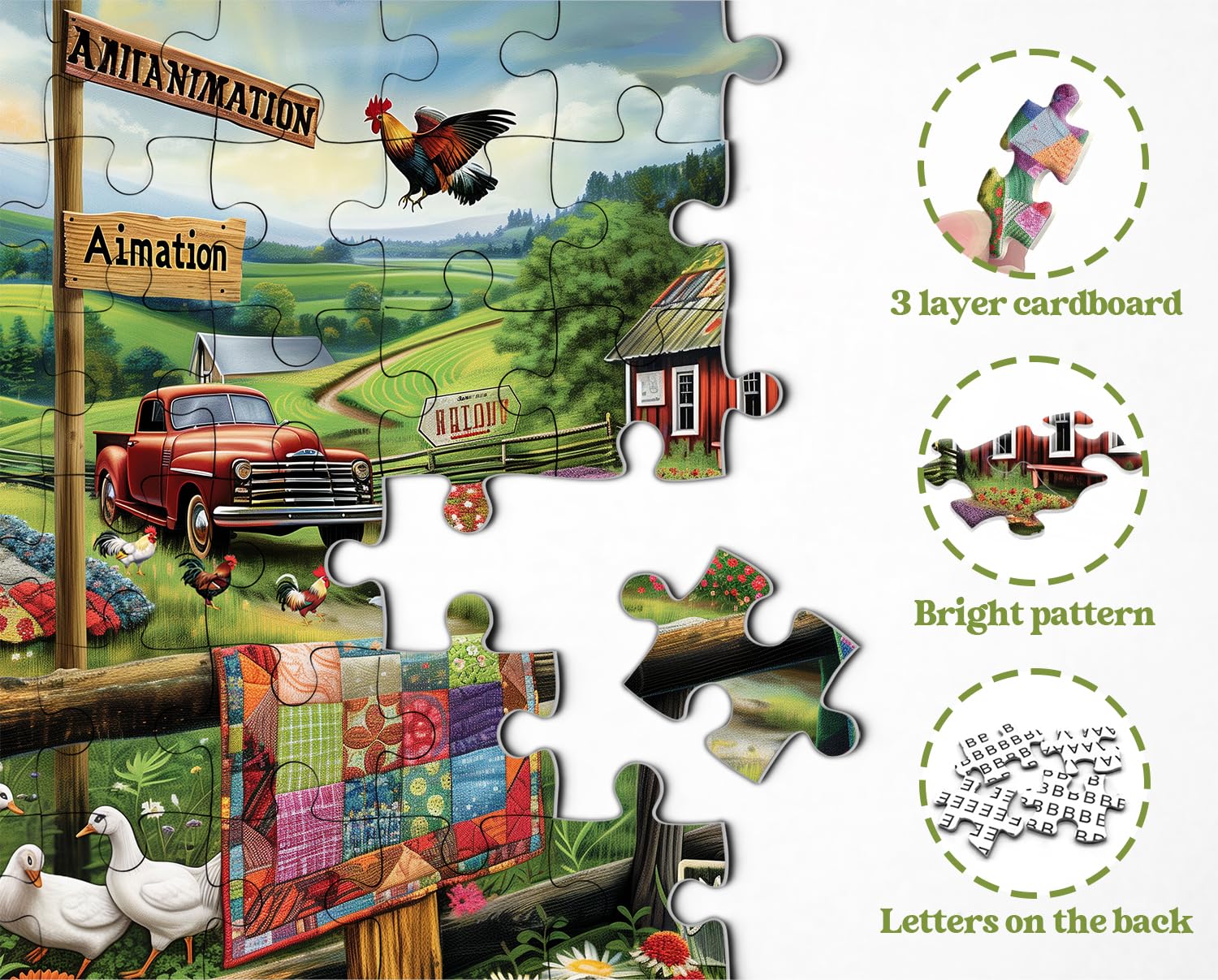 - Exquisite Workmenship: The jigsaw puzzles 1000 pieces animals farm is printed on three layers of thick white cardboard, precision cutting and clear printing, features vivid color and smooth surface, also has the letters on the back, will help you complete the puzzle