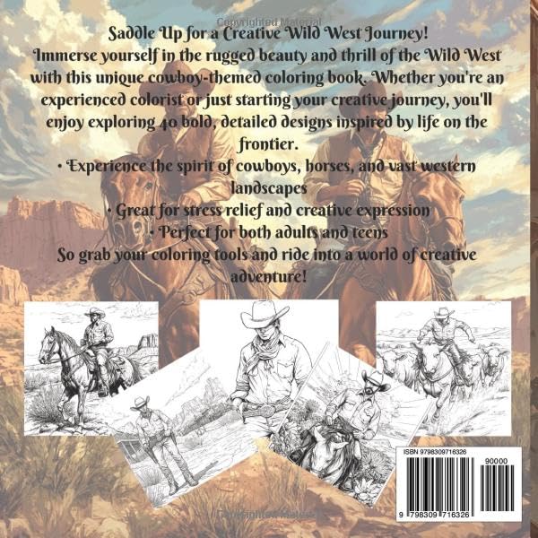 Wild West Cowboy Coloring Book for Adults & Teens — Saddle Up for a Creative Adventure! Step back in time and immerse yourself in the thrilling world of the Wild West with this action-packed cowboy coloring book. From fierce gunfighters and rugged outlaws to peaceful prairie landscapes and classic saloons, this book delivers hours of creative fun and relaxation. Why You’ll Love This Cowboy Coloring Book: 40 Unique, Hand-Drawn Wild West Scenes: Cowboys on horseback, thrilling shootouts, scenic deserts, and much more! Single-Sided Pages: No bleed-through–perfect for markers, colored pencils, gel pens, or paint. Ideal 8.5 x 8.5-Inch Size: Easy to handle yet spacious for detailed coloring. Great for All Skill Levels: Simple and intricate designs make it perfect for beginners and advanced colorists alike. Relaxation & Nostalgia: Relive the charm of the Old West while relieving stress. Perfect Gift for Cowboy and Wild West Enthusiasts: This unique coloring book makes a fantastic gift for: Birthdays & Celebrations: A creative and thoughtful surprise for Western fans. Father’s Day: Ideal for anyone who loves cowboy history and Americana culture. Holidays & Special Occasions: Bring excitement to the coloring table. Why Choose This Book? Whether you’re seeking a relaxing creative escape or an unforgettable gift, this cowboy-themed coloring book delivers adventure and inspiration. Order your copy today and ride into a world of coloring excitement! Yeehaw! 4o