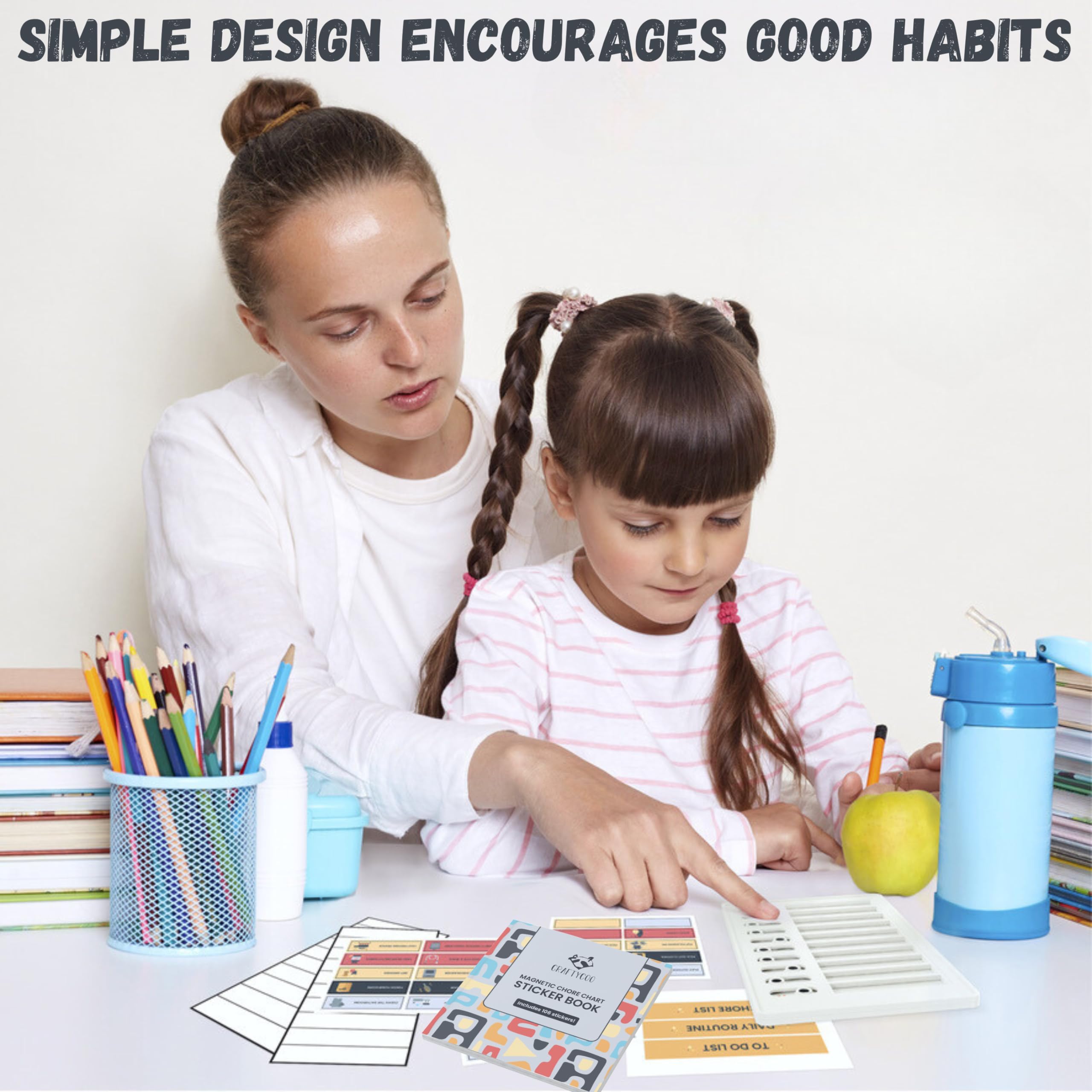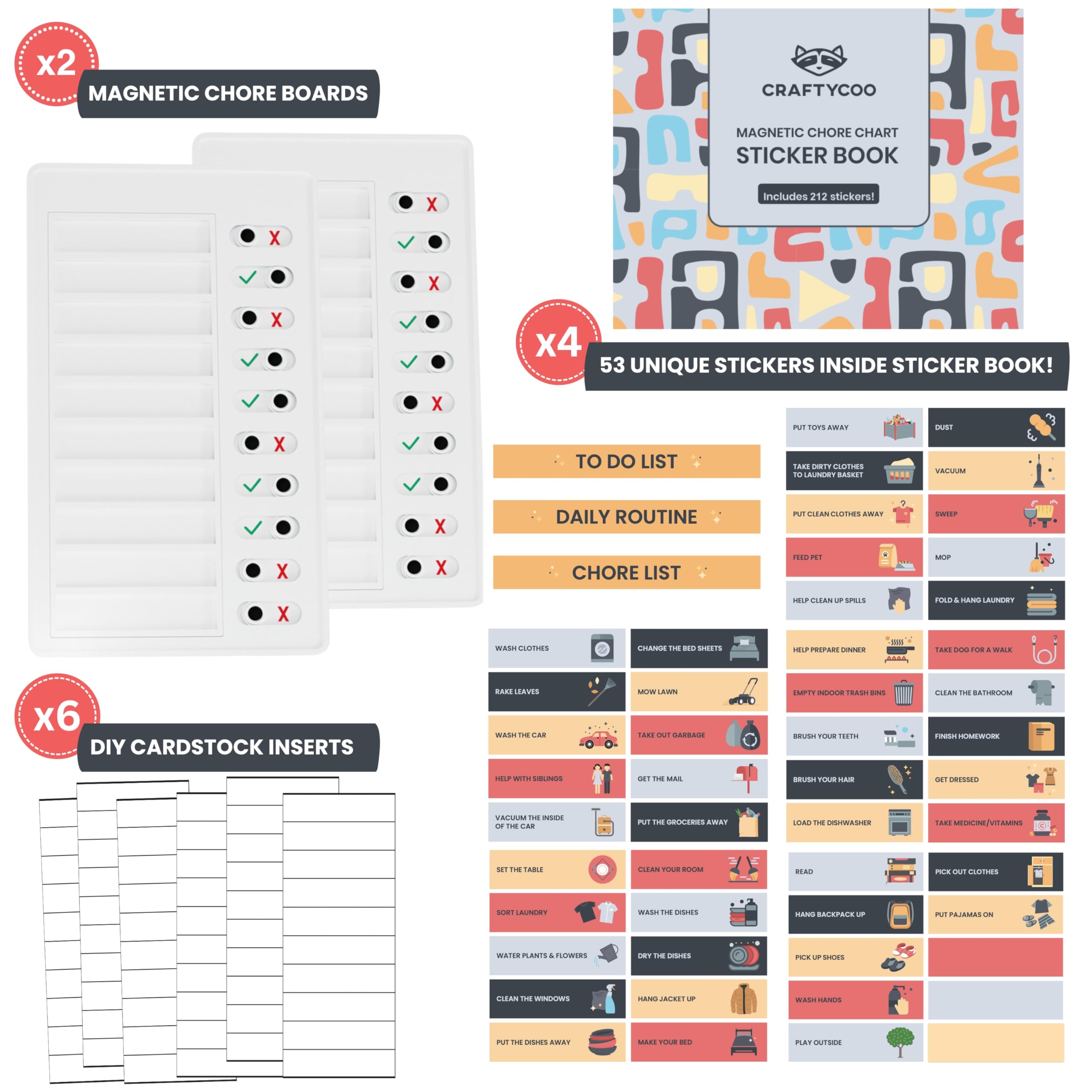 - FEATURES STICKER BOOK (212 STICKERS): The chore chart now includes a DIY-friendly chore chart sticker book with 4 sets of 53 unique stickers, along with 6 blank cardstock cards for customization. The chore stickers feature chore illustrations and bright colors to help kids feel excited about their achievements and reinforce positive behavior! No handwriting required!