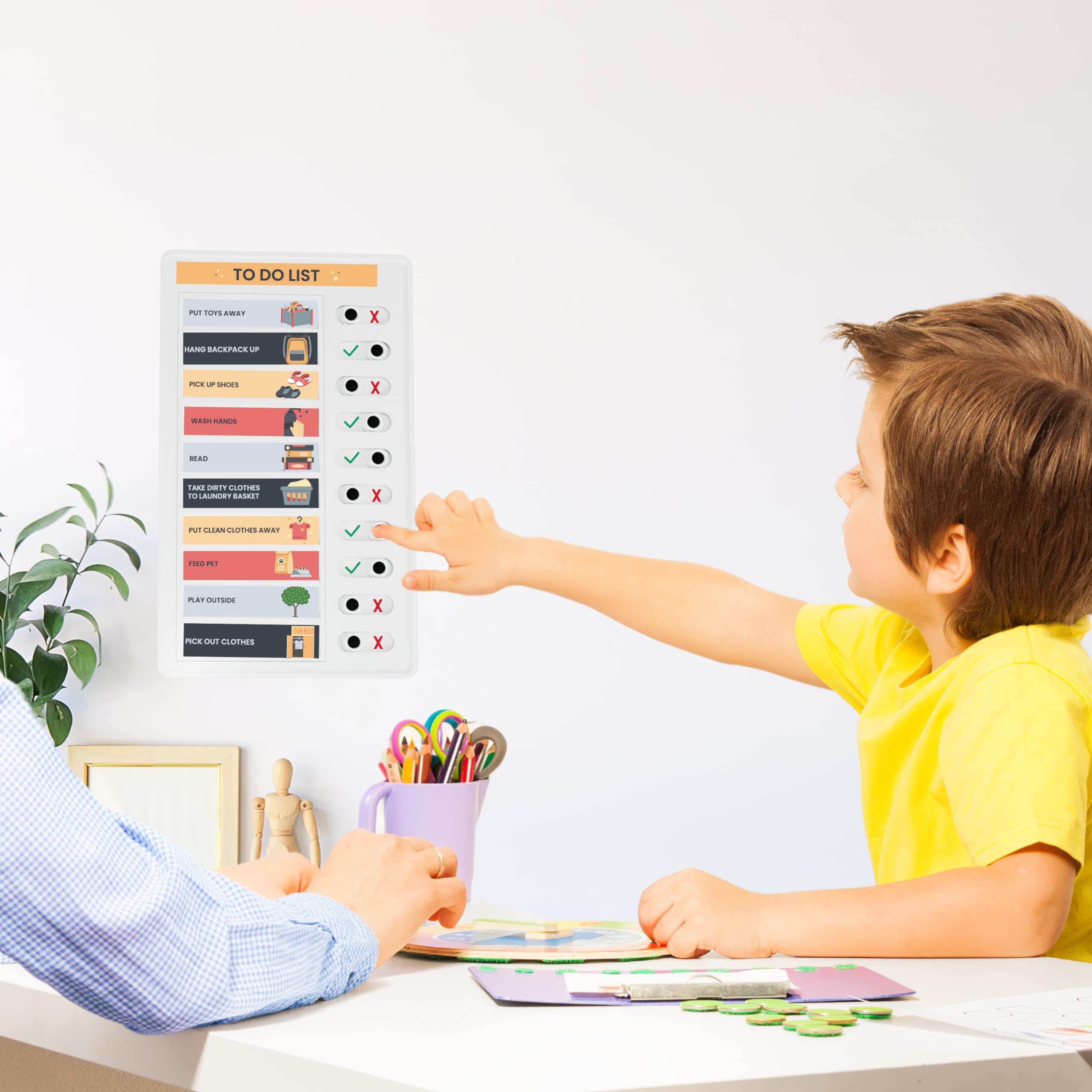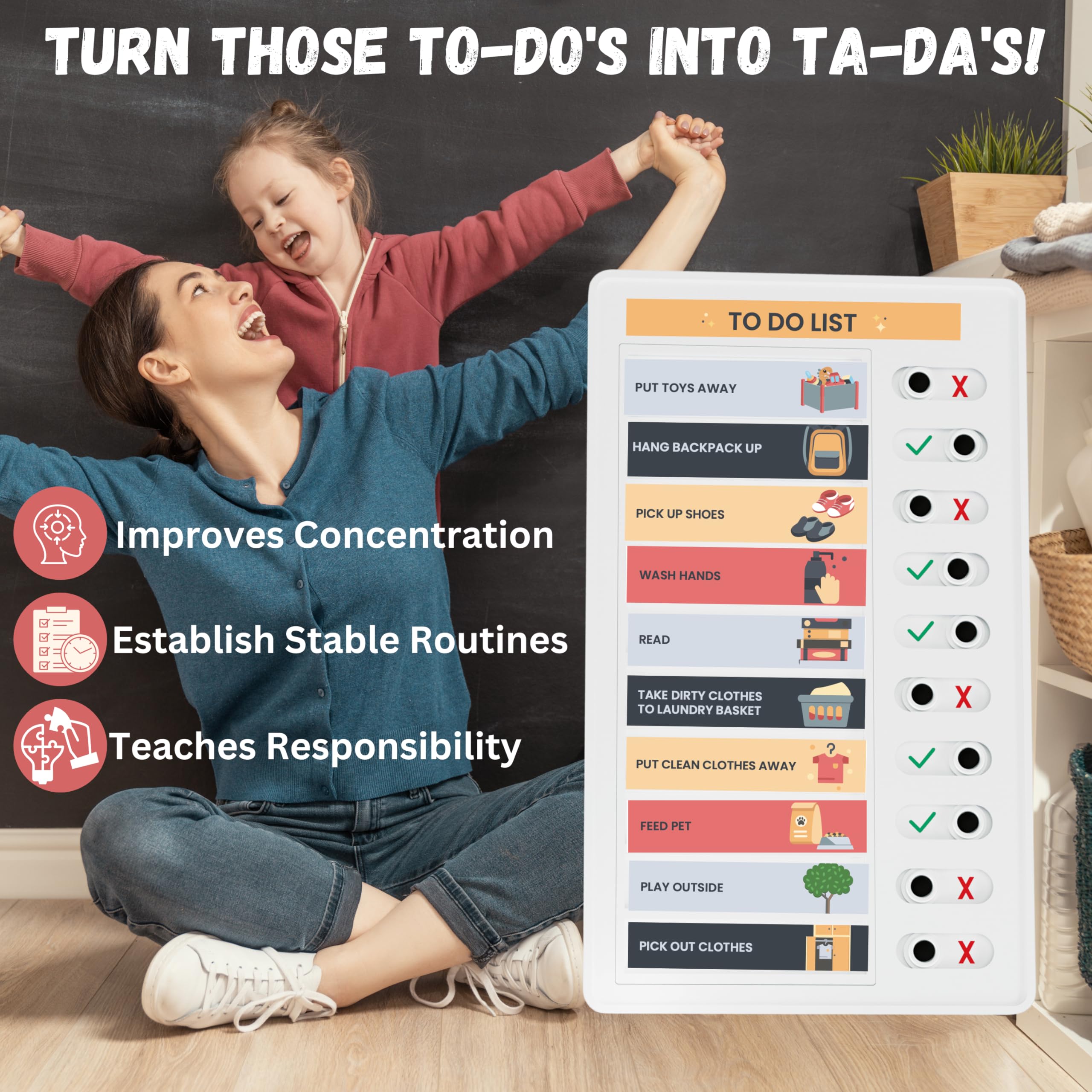 - BOOST PRODUCTIVITY: Experience the satisfaction of sliding buttons from ‘X’ to a delightful checkmark as tasks or chores are done. This simple versatile tool doubles as a reward chart or behavior chart, offering exciting incentives to enhance motivation and accomplishment.
