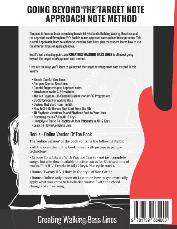 Going Beyond The Target Note/Approach Note Method The most influential book on walking bass is Ed Friedland’s Building Walking Basslines and the approach used throughout Ed’s book is to use approach notes to lead to target notes. This is a valid approach, leads to authentic sounding bass lines, plus the student learns how to use the different types of approach notes. But it’s just a starting point…and CREATING WALKING BASS LINES is all about going beyond the target note/approach note method. Here are the ways you’ll learn to go beyond the target note/approach note method in this Volume: Simple Chordal Bass Lines Complex Chordal Bass Lines Chordal Fragments plus Approach notes Introduction to the 7/3 Resolution The 7/3 Diagram – 36 Chordal Basslines for iim-V7 Progressions 80-20 Devices For Walking Bass Devices That Start From The 5th How To Set Up Devices That Start From The 5th 10 Rhythmic Variations To Add Rhythmic Push to Your Lines Practicing the ii-V7-I In All 12 Keys Using Cycle Tracks To Practice An Idea Efficiently in All 12 Keys Learn To Play In Complete Bars Bonus Online Version The ‘online version’ of the book contains the following items: All the examples in the book filmed with picture in picture technology. Unique Song Library With Practice Tracks – not just complete songs, but also downloadable practice tracks for 8 bar sections of tracks. Plus ii-V-I tracks in all 12 keys. Plus cycle tracks. Twenty ii-V-I lines in the style of Ron Carter. Lesson on how to systematically apply what you know to familiarize yourself with the chord changes of a new song. The online version of the book is free. All you have do is send a copy of your Amazon receipt or invoice to me at [email protected]. (Note: the bonus online version is not available for books sold second hand on Amazon Marketplace or other second hand book sites.) Start learning to go beyond the target note/approach note method by getting CREATING WALKING BASS LINES today.