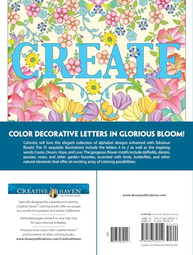 Colorists will love this elegant collection of alphabet designs enhanced with fabulous florals! The 31 exquisite illustrations include the letters A to Z, as well as inspiring words like “Dream” and “Hope,” beautifully decorated with realistic blooms. The gorgeous flower motifs include roses, daffodils, daisies, pansies, and other garden favorites, accented with birds and butterflies and other natural elements that offer an exciting array of coloring possibilities. Pages are perforated and printed on one side only for easy removal and display.