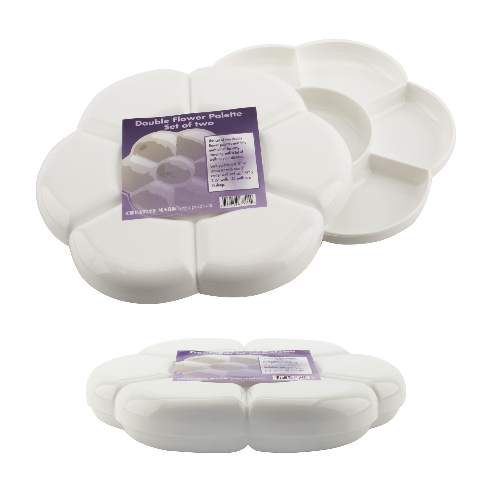 Introducing the Creative Mark Double Flower Nesting Watercolor Palette Set of 2 – the perfect companion for artists, plein air artists, and watercolorists seeking an efficient and organized approach to their painting sessions. This set includes two stackable paint palette plates, crafted from durable plastic and designed to enhance your artistic experience. Each palette features a unique double flower shape, with 6 outer wells and a central well, offering ample space for color mixing and paint storage. The center well serves a dual purpose, functioning as a convenient water basin or an additional mixing area. With a total of 14 color wells (7 in each palette), you’ll have plenty of room to experiment with various shades and hues, making this paint palette tray ideal for both acrylics and oil colors. The innovative design allows you to stack the smaller palette on top of the larger one, effectively keeping dirt and other elements out of your paint. While these palettes are stackable for easy storage and transport, please note that they do not seal. The white color and lightweight construction, with a 6-3/4″ diameter, make these palettes easy to carry and perfect for on-the-go artists. Cleanup is a breeze with the Creative Mark Double Flower Nesting Watercolor Palette Set. Simply rinse out unwanted paint with water and wipe down with a paper towel. As you add your watercolors to the wells, you’ll notice how they begin to blossom into their own work of art, enhancing your creative process. Choose Creative Mark for your next painting session and experience the difference with our expertly crafted paint and palette set. The set includes plastic paint palette trays, small paint palettes, and art palette trays that cater to a wide range of artistic styles and preferences. Embrace the ease of use and practicality of these plastic palettes for painting, and elevate your art with Creative Mark.