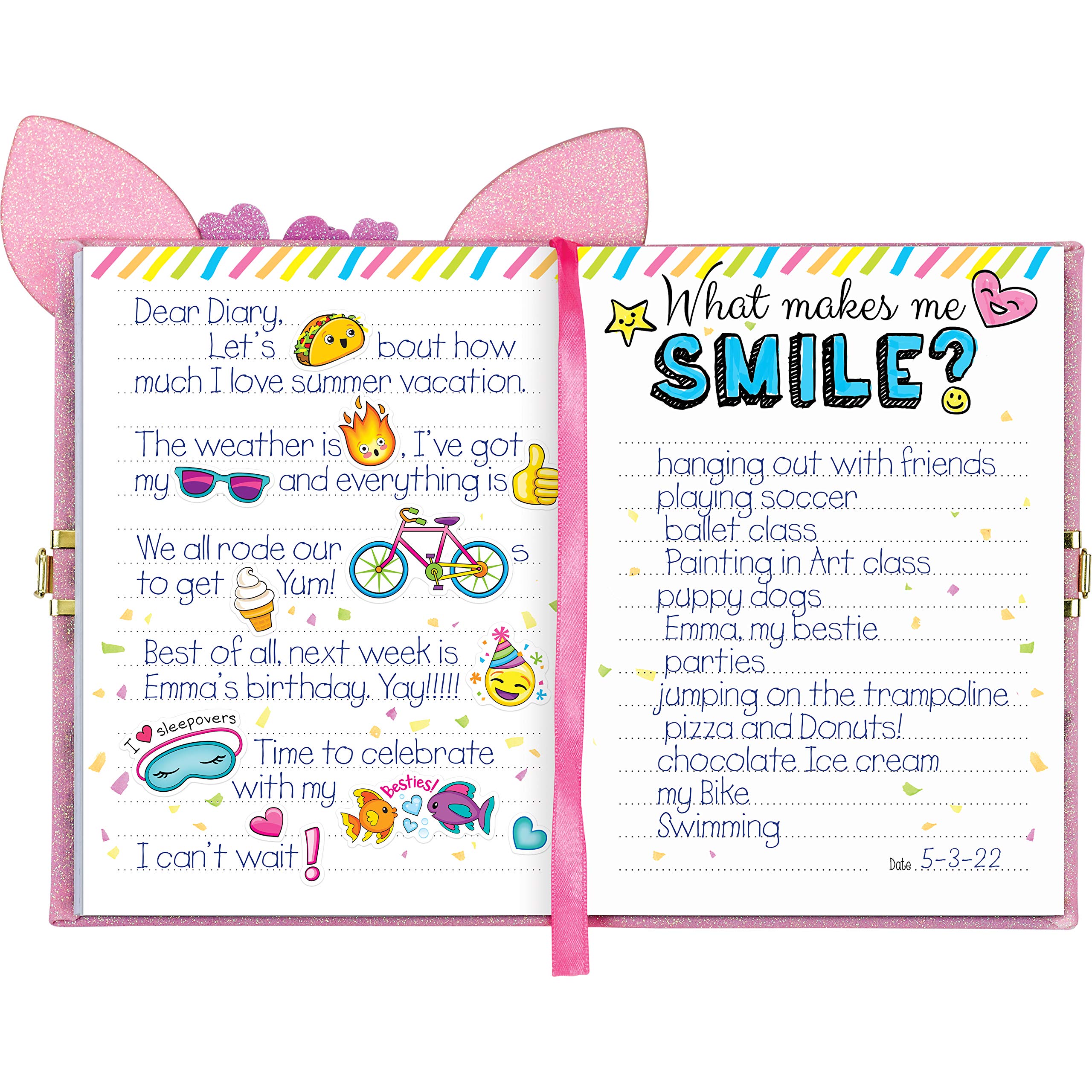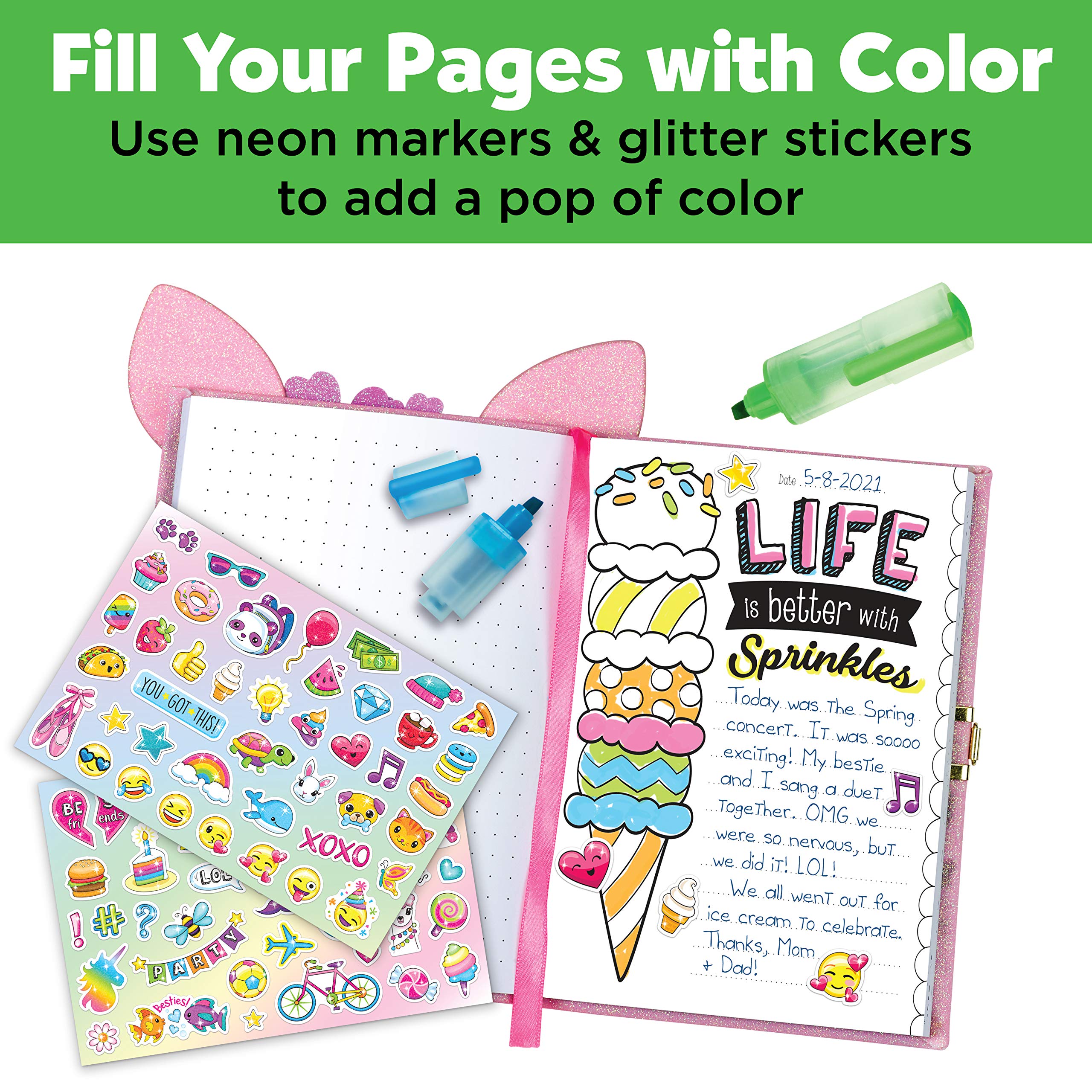 - WRITING JOURNAL FOR KIDS – No complicated calligraphy or journaling! Unlock your diary to discover positive aspiration art, writing prompts and plenty of punny pages to color and bring to life with 5 vibrant highlighters, stickers and a pom pom pen