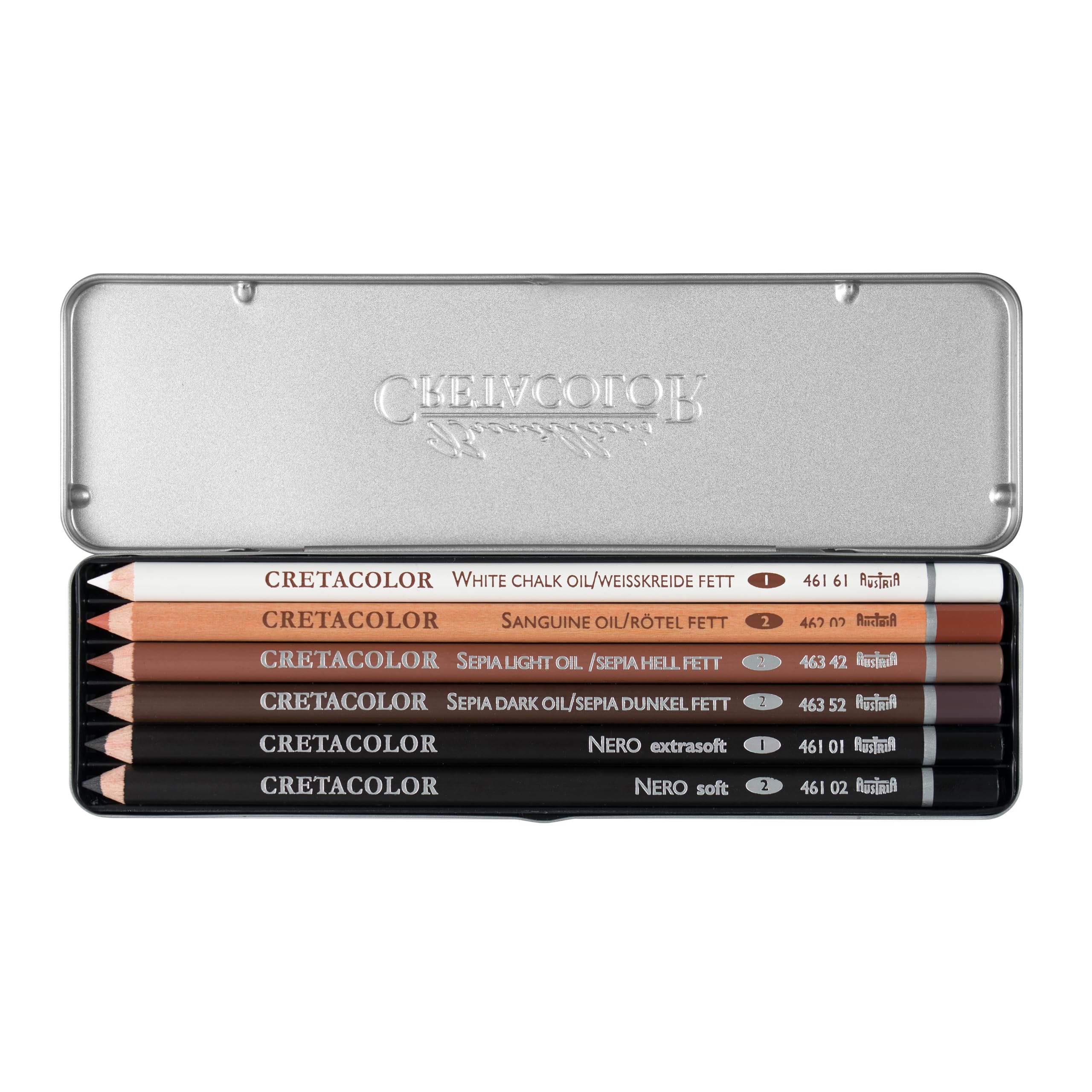 Cretacolor Oil Pencils are excellent for general purpose sketching and drawing when a dense shiny, smudge proof stroke is needed. They are oil based and therefore water resistant. This complete pocket tin set of 6 Artist’s oil pencils features the colors Nero black soft and x-soft, White, Sanguine, Sepia Light and Dark.