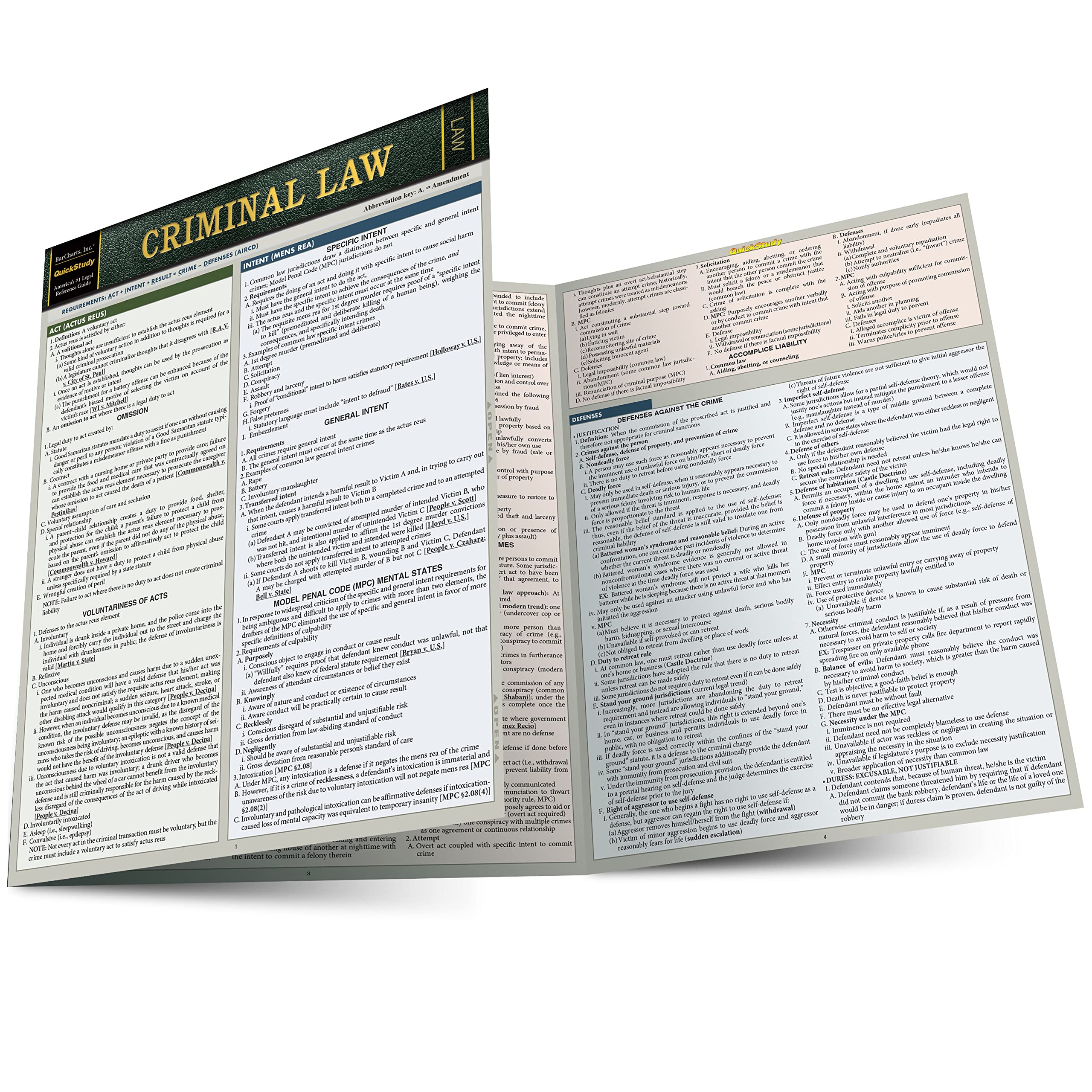 BarCharts Publishing, Inc was founded in 1991 with our law guides created by the owner attending law school. Since then many law professors, legal editors, and experts in their field of law have peer-reviewed, edited and updated the content, fine tuning the reference over 30 years. Designed to understand the significance of details within the larger scheme of the law, as a daily refresher, and to review before the Bar Exam. Reviewing and referencing essential details in a neatly organized tool offers a macro and micro view of Criminal Law which is valuable for understanding the whole of the law as the sum of its parts. We update our law guides for students, paralegals and practicing lawyers to have the most handy legal reference to the most important points of the law possible in 6 laminated pages. For such a great price you will not find another law reference this easy to purchase. 6 page laminated guide includes: Act (Actus Reus) Omission Voluntariness of Acts Intent (Mens Rea) Specific Intent General Intent Model Penal Code (MPC) Mental States Strict Liability Causation Crimes Classification of Crimes Crimes Against the Person Crimes Relating to Property Inchoate Crimes Accomplice Liability Defenses Defenses Against the Crime Criminal Capacity Defenses Constitutional Defenses Purposes of Punishment Burden of Proof NOTE: To offer this much information in six pages and for this incredible value, text size can be small but no smaller than default smart phone sized text. For those with poor vision, up-to-date prescription glasses or contacts may be necessary.