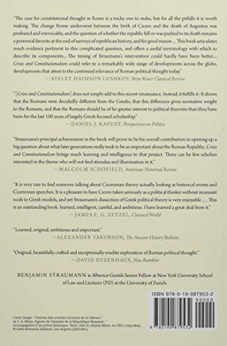 Crisis and Constitutionalism argues that the late Roman Republic saw, for the first time in the history of political thought, the development of a normative concept of constitution–the concept of a set of constitutional norms designed to guarantee and achieve certain interests of the individual. Benjamin Straumann first explores how a Roman concept of constitution emerged out of the crisis and fall of the Roman Republic. The increasing use of emergency measures and extraordinary powers in the late Republic provoked Cicero and some of his contemporaries to turn a hitherto implicit, inchoate constitutionalism into explicit constitutional argument and theory. The crisis of the Republic thus brought about a powerful constitutionalism and convinced Cicero to articulate the norms and rights that would provide its substance; this typically Roman constitutional theory is described in the second part of the study. Straumann then discusses the reception of Roman constitutional thought up to the late eighteenth century and the American Founding, which gave rise to a new, constitutional republicanism. This tradition was characterized by a keen interest in the Roman Republic’s decline and fall, and an insistence on the limits of virtue. The crisis of the Republic was interpreted as a constitutional crisis, and the only remedy to escape the Republic’s fate–military despotism–was thought to lie, not in republican virtue, but in Roman constitutionalism. By tracing Roman constitutional thought from antiquity to the modern era, this unique study makes a substantial contribution to our understanding of Roman political thought and its reception.