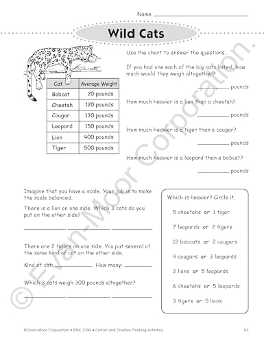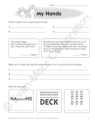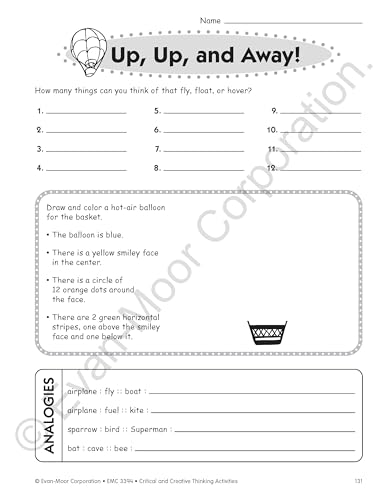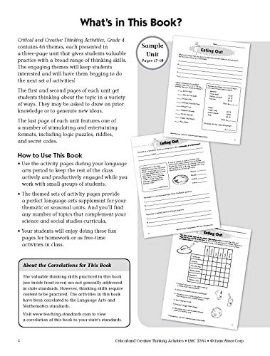 Evan-Moor Critical And Creative Thinking Activities Book of 140+ pages of fun, imaginative activities to practice thinking with variety of curriculum and theme based topics. It has 46 theme-based units with activities that fit the core curriculum like places: my room, my school, the supermarket, at the dinner table, eating out, in the car, on a walk, at the library, at the beach, on a field trip or nature in action: 6-legged crawlies, big birds, wild cats, ssssnakes, dolphins and whales, trees, mountains, caught in a storm and people: fictional characters, friends, family tree, who’s in charge?. It also has fantasy: superheroes, elves and fairies, dragons, kings and queens, magic, mythical creatures or things i use: my bike, my pencil, my hands, the dictionary, locks and keys, manners, hats and caps and in my world: presents, chores, our earth, garbage, colorific!, cats and dogs, lost and found, up, up and away, help!, sticky stuff, rules. It is ideal for grade 4 students.