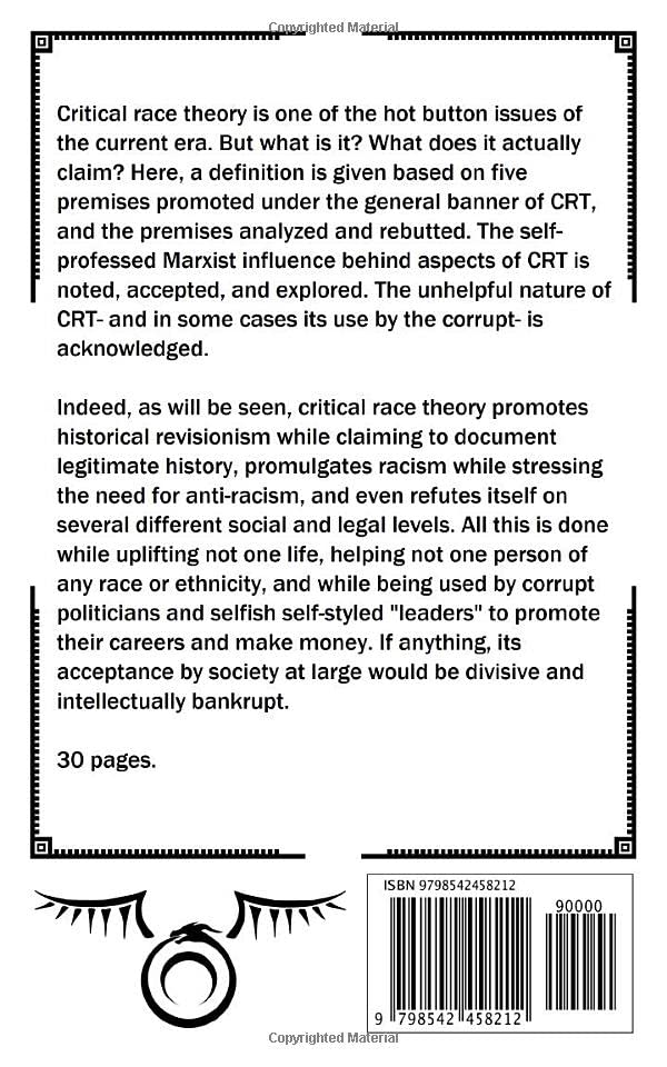 Critical race theory is one of the hot button issues of the current era. But what is it? What does it actually claim? Here, a definition is given based on five premises promoted under the general banner of CRT, and the premises analyzed and rebutted. The self-professed Marxist influence behind aspects of CRT is noted, accepted, and explored. The unhelpful nature of CRT- and in some cases its use by the corrupt- is acknowledged. Indeed, as will be seen, critical race theory promotes historical revisionism while claiming to document legitimate history, promulgates racism while stressing the need for anti-racism, and even refutes itself on several different social and legal levels. All this is done while uplifting not one life, helping not one person of any race or ethnicity, and while being used by corrupt politicians and selfish self-styled “leaders” to promote their careers and make money. If anything, its acceptance by society at large would be divisive and intellectually bankrupt.