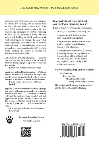 This fifth edition of Critical Thinking by the noted logician Richard L. Epstein is practical, engaging, and easy to teach. Students enjoy and understand it because it is clear and has hundreds of examples using a cast of characters who reason as we do every day. More than 1,000 exercises lead students to be able to reason well in their courses and their lives. Essay writing lessons and visual writing lessons, using the cast of characters, teach students that first comes clear thinking and then comes clear writing. A complete and comprehensive Instructor’s Manual makes the text easy to teach and grade. New to this edition: chapters on explanations and reasoning in the sciences. Also from the Advanced Reasoning Forum: An Introduction to Formal Logic and The Pocket Guide to Critical Thinking.