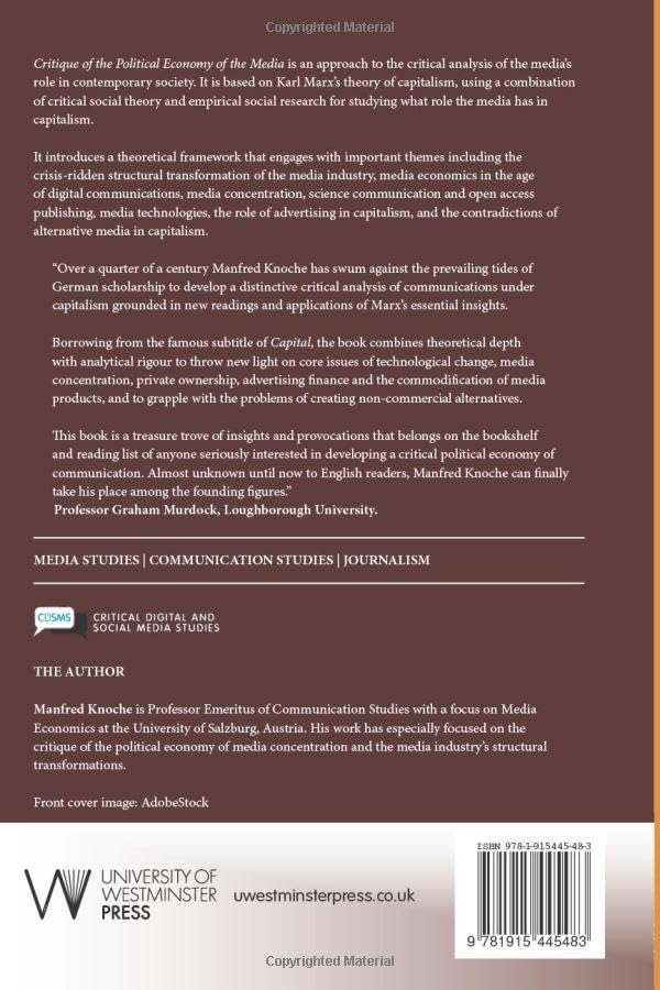 Critique of the Political Economy of the Media is an approach to the critical analysis of the media’s role in contemporary society. It is based on Karl Marx’s theory of capitalism, using a combination of critical social theory and empirical social research for studying what role the media has in capitalism. It introduces a theoretical framework that engages with important themes including the crisis-ridden structural transformation of the media industry, media economics in the age of digital communications, media concentration, science communication and open access publishing, media technologies, the role of advertising in capitalism, and the contradictions of alternative media in capitalism.