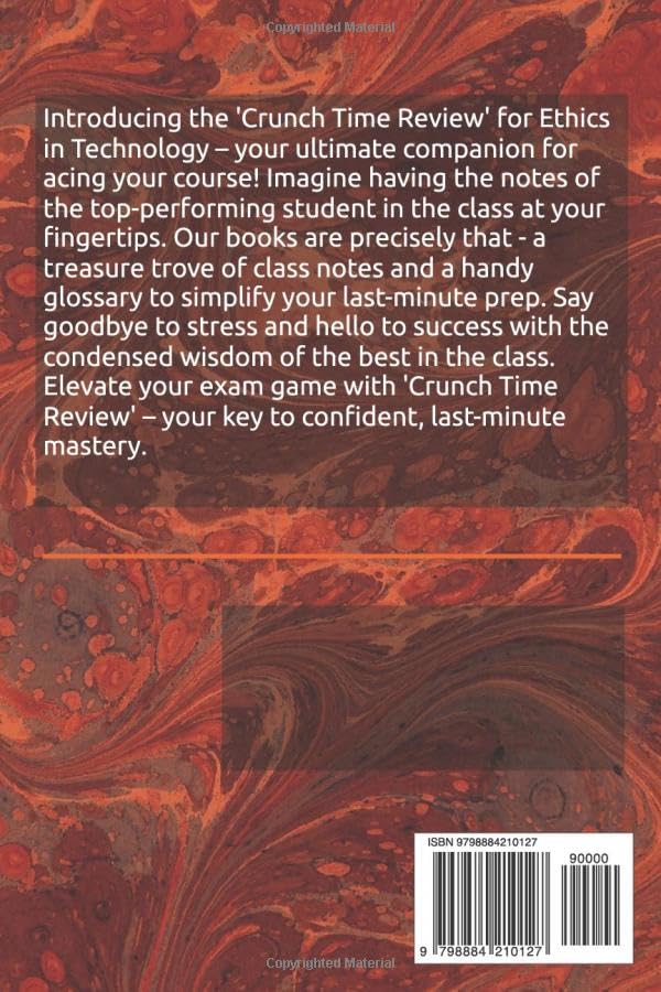 Stop Struggling to Study and Pass Your Exam Today! Transform pre-exam panic into confidence, one page at a time with the Crunch Time Review for the Ethics in Technology – your ultimate guide to acing your course and exams. Crafted with the understanding that time is of the essence, this series is meticulously designed to streamline your review process. Elevate your exam game with ‘Crunch Time Review’ – your key to confident, last-minute mastery. Simplify your last-minute prep with the condensed wisdom of the top-performing student in the class Say goodbye to stress and hello to success with the ultimate companion for your exam preparation Transform pre-exam panic into confidence with the big ideas and key terms at your fingertips In this comprehensive guide you will learn how to Streamline your review process with each book distilling the essence of the subject into ten big ideas swiftly improve comprehension and retention with clear, straightforward language and an intuitive layout Reinforce your understanding with a detailed glossary of key terms Make procrastination a thing of the past with an engaging format and focused presentation of information Boost your confidence, cut through the noise, and enhance your readiness for the exam Your go-to resource for conquering exam stress and achieving your best score that is designed for efficiency, clarity, and success in the critical moments before your exam Join the countless students who have turned their last-minute preparations into success stories Don’t wait – Click BUY NOW and be ready to face the challenge of the exam.