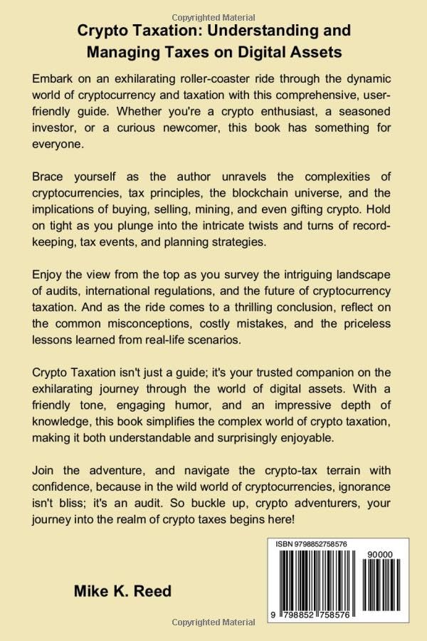 “Crypto Taxation: Understanding and Managing Taxes on Digital Assets” is an indispensable guide that breaks down the complex world of cryptocurrency taxes into easily digestible pieces. Whether you’re a newbie dipping your toes into the crypto pond or an experienced investor swimming in a sea of digital coins, this book will make tax matters less daunting and more comprehensible. Beginning with an introduction to cryptocurrencies and basic taxation principles, the book takes you on a comprehensive journey through the cryptocurrency ecosystem. You will learn about different types of cryptocurrencies, blockchain technology, exchanges, wallets, mining, and staking. The adventure doesn’t stop there. The book dives deep into the tax implications of cryptocurrency activities, including buying, selling, mining, gifting, and even donating. You will learn about record-keeping strategies for crypto transactions, what triggers tax events, and how to understand and handle capital gains and losses. But the excitement doesn’t end with understanding. This guide provides practical tips for crypto tax planning and preparation, guidance for dealing with audits and legal issues, and enlightening information about international regulations. It also prepares you for the future, discussing emerging trends in the crypto space and anticipated changes in tax laws. Packed with real-world case studies and examples, this guide debunks common crypto tax myths and provides lessons from common mistakes. Its friendly tone, engaging humor, and technical yet accessible language make it an enjoyable and educational read. “Crypto Taxation” is more than just a guide; it’s a compass, leading you through the often confusing wilderness of the crypto-tax world. Don’t navigate this terrain without it.