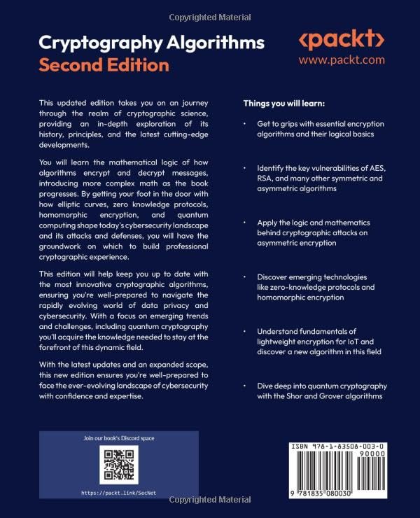 Master real-world cryptography with updated algorithms, enhanced encryption techniques, and modern defenses in this latest edition of Cryptographic Algorithms Purchase of the print or Kindle book includes a free eBook in PDF format. Key Features Gain expertise in cryptographic algorithms from classical encryption to quantum-resistant security. Become a forward-thinking cryptographer by diving into next-gen encryption with zero-knowledge proofs, homomorphic encryption, and post-quantum cryptographic techniques. Analyze vulnerabilities and see how cryptographic algorithms protect against modern cyber threats. Book Description As cyber threats evolve, so must our cryptographic defenses. This updated edition of Cryptographic Algorithms delves into the latest advancements in encryption, cybersecurity, and data protection, ensuring you stay ahead in this rapidly changing field. Whether you’re an aspiring or seasoned cybersecurity professional, this book equips you with the expertise to confidently tackle modern security challenges. Written by Dr. Massimo Bertaccini–a cryptography researcher, inventor, and cybersecurity expert–this book goes beyond theory, offering real-world applications backed by his inventions and patents. His expertise in zero-knowledge proofs, homomorphic encryption, and blockchain security makes this an essential resource for mastering cryptographic security. With updated algorithms, in-depth explanations, and a comprehensive overview of next-gen cryptographic advancements, this second edition provides the tools to protect sensitive data, implement secure cryptographic systems, and defend against emerging cybersecurity threats. By the end of this book, you’ll have hands-on expertise in modern cryptographic techniques–empowering you to build robust security solutions and stay at the forefront of cybersecurity innovation. What you will learn Become proficient in key cryptographic algorithms, including AES, RSA, and quantum-resistant encryption Identify vulnerabilities in symmetric and asymmetric encryption to strengthen security defenses Apply zero-knowledge protocols to enhance privacy and authentication Implement homomorphic encryption for secure data processing Evaluate emerging cryptographic inventions to counter evolving threats Identify and defend against logical attacks in cryptographic systems Analyze quantum cryptography through the Shor and Grover algorithms Who this book is for This book is for cybersecurity professionals, enthusiasts, and anyone looking to master modern cryptography and advance their cybersecurity career. It covers key cryptographic algorithms, mathematical concepts, and emerging technologies. The book addresses mathematical issues related to the algorithms that may arise. A background in university-level mathematics, algebra, modular arithmetic, finite fields theory, and knowledge of elliptic curves and quantum computing, will help readers get the most out of this book. Table of Contents Deep Dive into Cryptography Symmetric Encryption Algorithms Asymmetric Encryption Algorithms Hash Functions and Digital Signatures Zero-Knowledge Protocols New Inventions in Cryptography and Logical Attacks Elliptic Curves Homomorphic Encryption and Crypto Search Engine Quantum Cryptography Quantum Search Algorithms and Quantum Computing