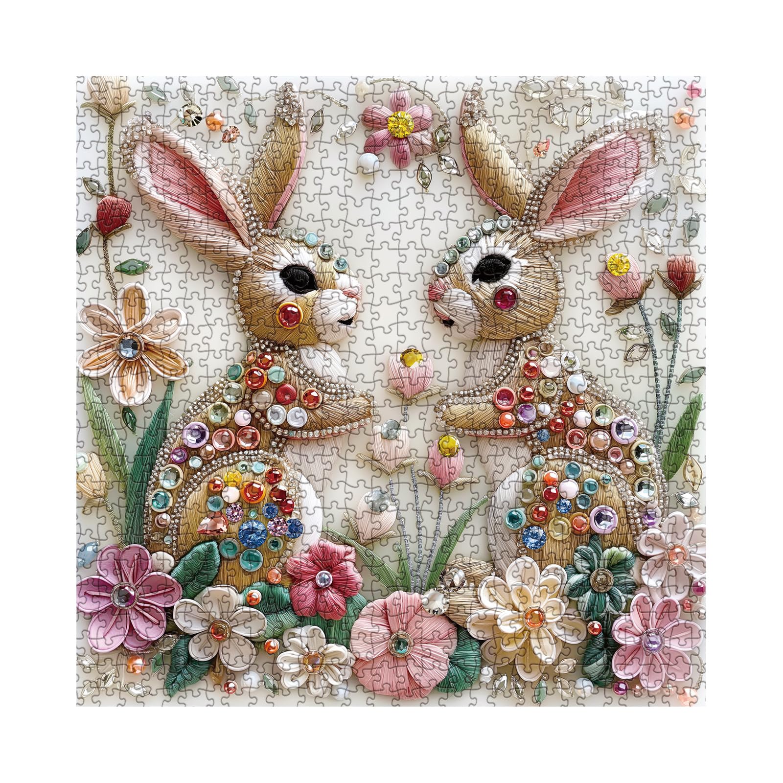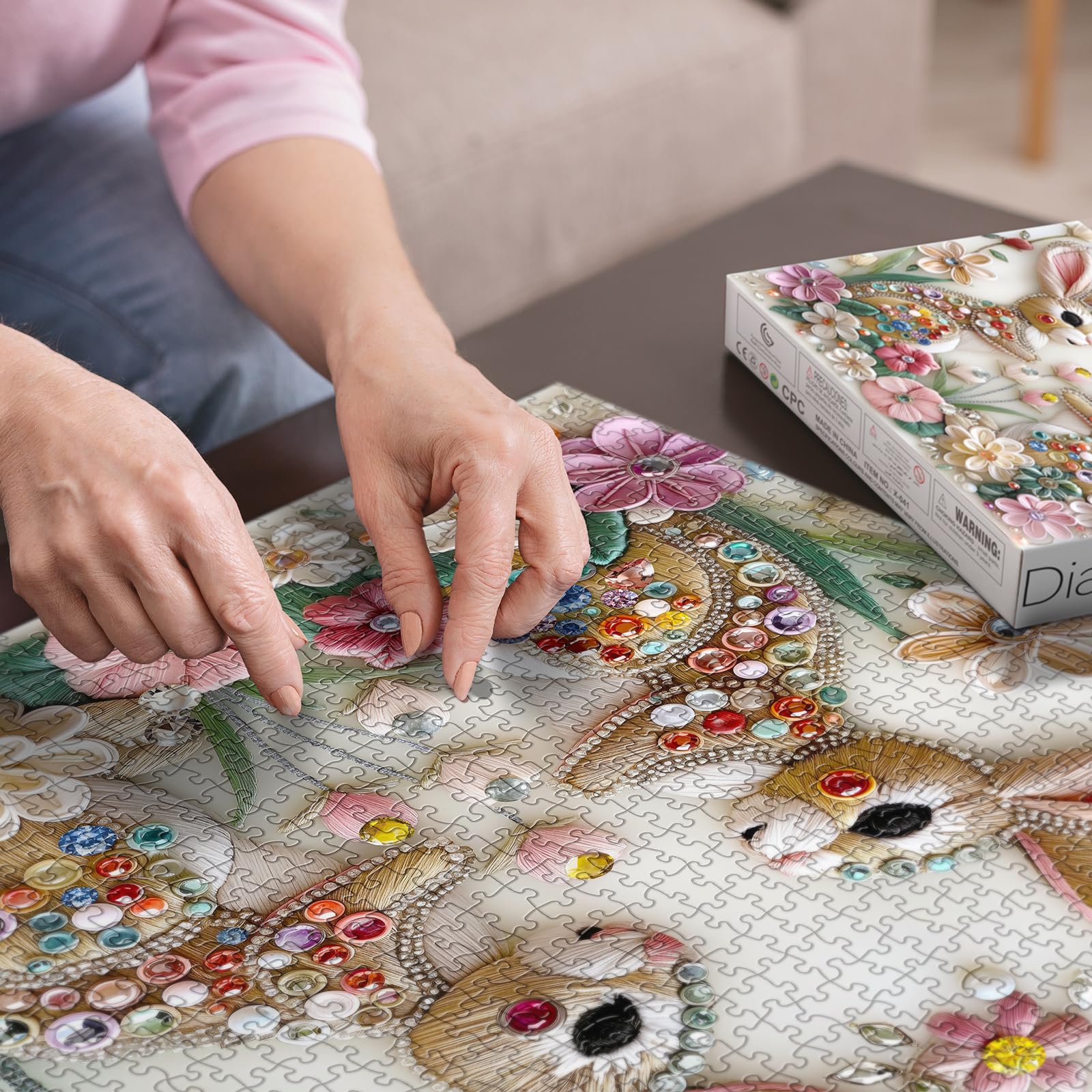Crystal Bunny Flower Puzzles for Adults 1000 Pieces, Cute Animal Diamond Jigsaw Puzzles, Rabbit Floral Art Puzzles