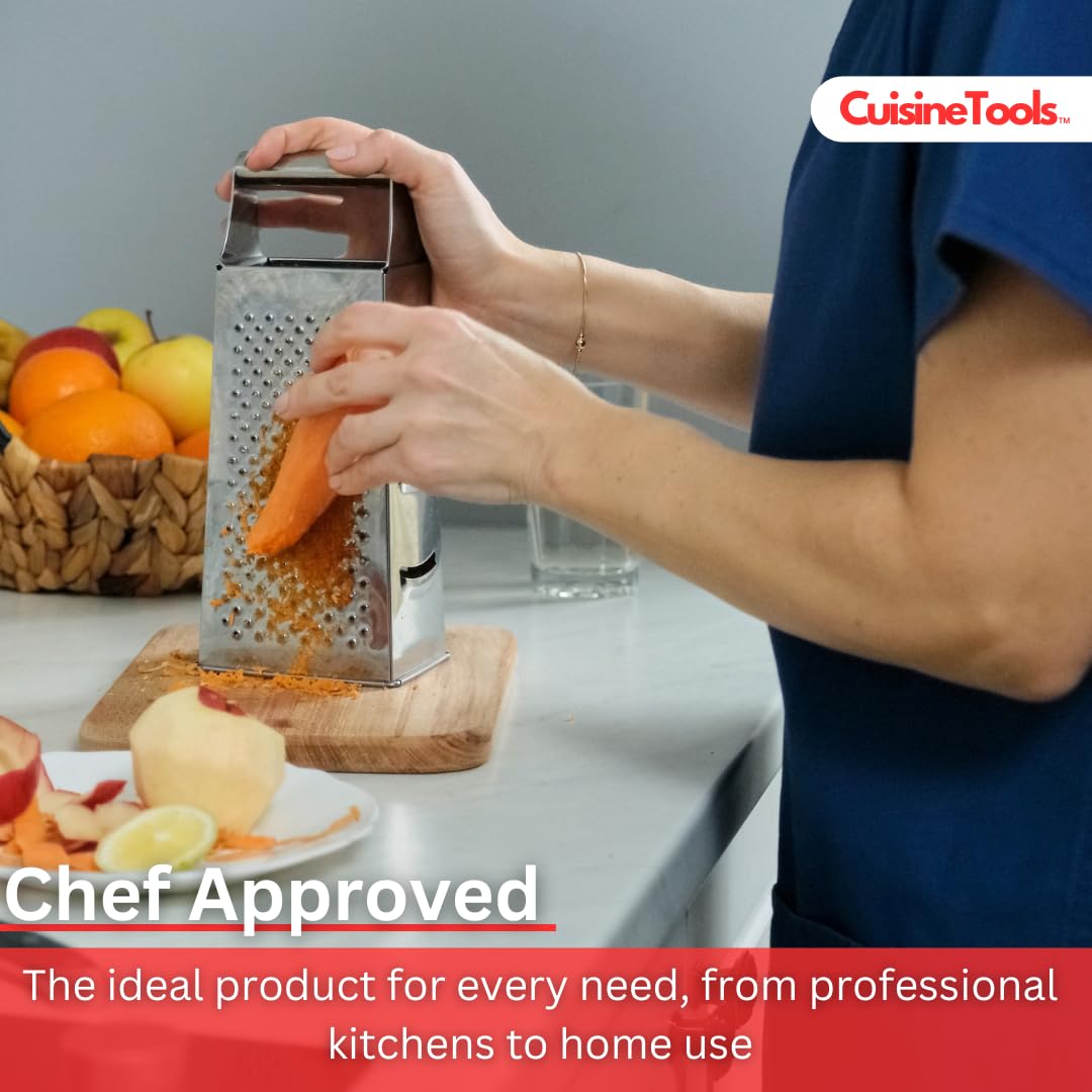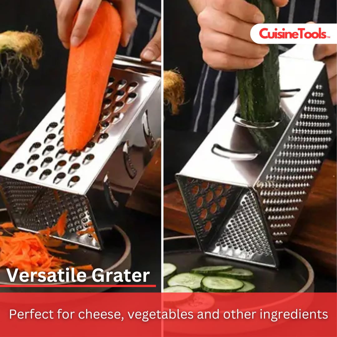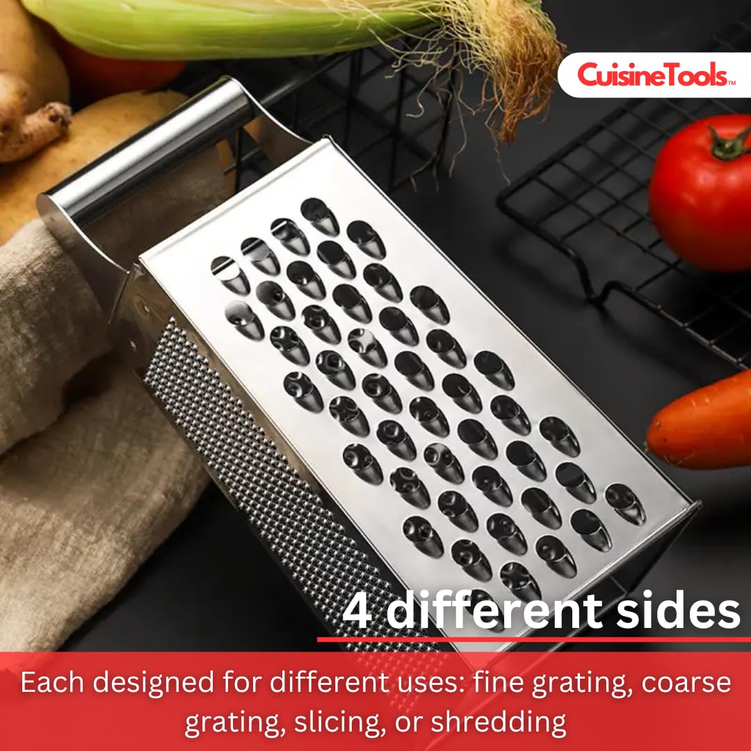 CuisineTools 4-Sided Stainless Steel Cheese Grater with New Ergonomic Handle, Multifunctional Box Grater for Cheese, Parmesan, and Vegetables, Dishwasher Safe