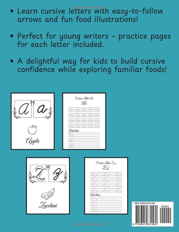 Make learning cursive writing enjoyable and engaging with this Cursive Alphabet Practice Book for Kids! Tailored for young learners, this book combines effective cursive handwriting practice with charming food illustrations to make mastering each letter fun and memorable. Each letter includes clear directional arrows and guidance, helping children build fine motor skills and confidence in cursive handwriting. What’s Inside: Step-by-Step Cursive Letters – Each page features an uppercase and lowercase letter in cursive with arrows showing the correct writing direction, making it simple for children to follow along. Food-Themed Illustrations – Each letter is paired with a familiar food item, such as apples, ice cream, or mango alongside its name, making practice sessions exciting and helping kids make connections with recognizable items. Practice Worksheets – Following each letter page, kids can use the adjoining worksheet to practice tracing and writing each letter independently, building up their cursive skills at their own pace. Why This Book is Perfect for Parents and Teachers: Educational and Fun – Combines fine motor skills and letter formation practice with engaging food illustrations, making learning cursive easier and more enjoyable. Perfect for Beginners – Designed for young children learning cursive for the first time, ideal for use at home, in classrooms, or as a homeschooling resource. A Thoughtful Gift for Young Writers – A wonderful gift for parents, teachers, or caregivers seeking an engaging way to teach cursive writing to kids. Book Details: Size: 8.5 x 11 inches, perfect for little hands to hold and write on comfortably Pages: Single-sided to prevent bleed-through, making each practice page easy to write Suitable for: Crayons, pencils, or colored markers Encourage your child to master the art of cursive writing while introducing them to their favorite food items! With each page designed to enhance their handwriting and confidence, this book is the ideal learning tool. Order your copy today and watch your child write their way to cursive success!