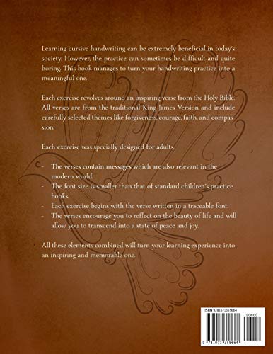 Meaningful and Inspirational- Cursive Handwriting Practice for Adults with Verses from the Bible! Learning cursive handwriting can be extremely beneficial in today’s society. However, the practice can sometimes be difficult and quite boring. This book manages to turn your handwriting practice into a meaningful one. Each exercise revolves around an inspiring verse from the Holy Bible. All verses are from the traditional King James Version and include carefully selected themes like forgiveness, courage, faith, and compassion. Each exercise was specially designed for adults. The verses contain messages which are also relevant in the modern world. The font size is smaller than that of standard children’s practice books. Each exercise begins with the verse written in a traceable font. The verses encourage you to reflect on the beauty of life and will fill you up with peace and joy. Get insight into some of the most profound verses from the Bible and discover how to improve your handwriting simultaneously. All these elements combined will turn your learning experience into an inspiring and memorable one. It’s never too late to expand your knowledge and become a master at handwriting. Regardless of your age, this book has value for everybody. If you are looking to get inspired and conquer the art of cursive handwriting, then scroll up and click the “Add to Cart” button now! Start your journey towards handwriting mastery!