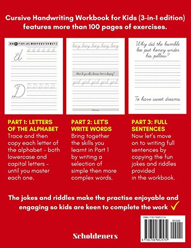 Cursive Workbook for Kids Ages 6-12 – The Most Fun, Engaging & Comprehensive Way To Learn Cursive Handwriting Filled with funny jokes, riddles and words of encouragement to motivate the child as they progress through the workbook. IMPORTANT: This cursive handwriting workbook uses the standard, traditional American cursive letter formations – Beware other workbooks that use non-standard forms. PART 1: LETTERS OF THE ALPHABET Trace and then copy each letter of the alphabet – both lowercase and capital letters – until each one is mastered. PART 2: WRITING WORDS Bring together the skills you learnt in Part 1 by writing a selection of simple then more complex words. Each page features a fun joke. PART 3: FULL SENTENCES Move on to writing full sentences by copying the jokes and riddles provided in the workbook. This 3-in-1 workbook will gently guide the child from beginner until they are happy and confidently writing sentences. 8.5″ x 11″ – Large size provides plenty of room for writing inside. 110 pages – with more than 100 pages of writing exercises. High-quality paper – 60gm. Handwriting Practice for Kids that is Made in the USA.
