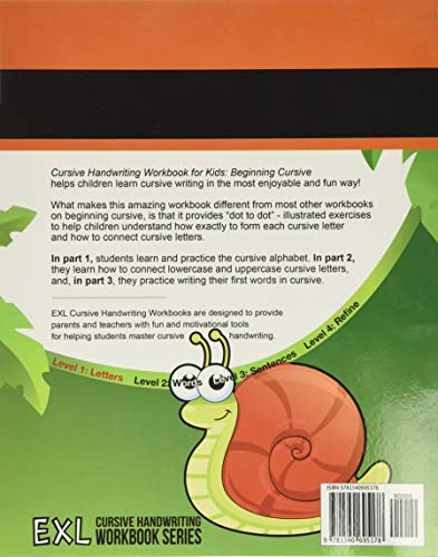 Cursive Handwriting Workbook for Kids: Beginning Cursive helps children learn the basics of cursive writing in the most enjoyable and fun way! What makes this amazing workbook different from most other workbooks on beginning cursive, is that it provides “dot to dot”- illustrated exercises to help children understand how exactly to form each cursive letter and how to connect cursive letters. In part 1, students learn and practice the cursive alphabet. They have to draw the snail’s trail inside the letter with a marker, following numbered dots, a fun way to learn how exactly to form each letter. Afterward, they practice writing the letter by tracing inside it and copying it multiple times. In part 2, students learn how to connect lowercase and uppercase cursive letters, and, in part 3, they practice writing their first words in cursive. An ideal STARTING POINT for BEGINNERS! Easily learn to write the cursive alphabet! Learn how to connect letters and form words! Unique Play & Learn system with “dot-to-dot”-illustrated exercises! Appropriate for Grades 2-5! Reproducible: Parents and teachers may reproduce worksheets for use at home or in class! Note: This workbook is for beginners (Level 1). It is the first book of our Cursive Handwriting Workbook Series and it is meant to be used in the context of adult-guided lessons. Its purpose is to help children learn the cursive alphabet as well as to understand how to connect cursive letters and form short words in cursive. Upon finishing this workbook, students will be ready to move on to more advanced workbooks that will help them practice writing words (Level 2) and sentences (Level 3) with a goal to build fluency. TAGS:Cursive writing practice for kids, cursive handwriting practice for kids, cursive workbooks, cursive writing workbooks for kids, cursive handwriting workbook, cursive handwriting workbooks, cursive handwriting books,workbook cursive, practice cursive writing, beginning cursive, cursive writing practice book, beginning cursive handwriting workbook, grade 2, grade 3, grade 4, grade 5, traditional cursive