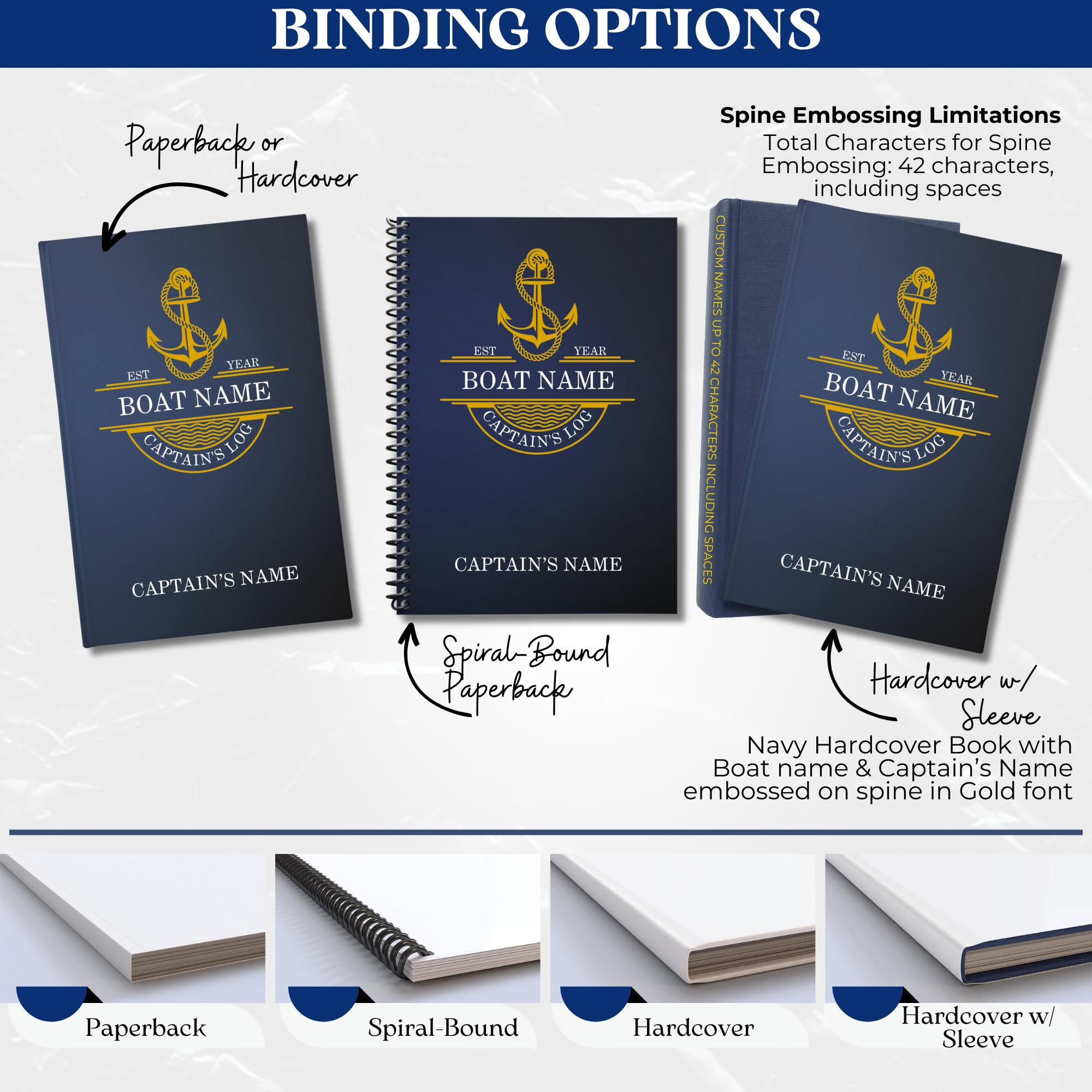****SPECIAL NOTE: HARDCOVER WITH SLEEVE**** Gold Embossing Limitations: Boat Name and Captain’s Name: Up to 42 characters. These limitations apply only to gold embossing on the spine for Hardcover with SLEEVE option.