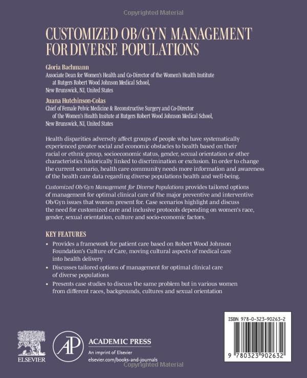 Customized Ob/Gyn Management for Diverse Populations provides tailored options of management for optimal clinical care of the major preventive and interventive Ob/Gyn issues. Case scenarios highlight and discuss the need for customized care and inclusive protocols that depend on each woman’s race, gender, sexual orientation, culture and socio-economic factors. As health disparities adversely affect groups of people who have systematically experienced greater social and economic obstacles to health based on their racial or ethnic group, socioeconomic status, gender, sexual orientation or other characteristics historically linked to discrimination or exclusion, this book provides a welcomed resource. The book highlights the fact that in order to change the current scenario the health care community needs more information and awareness of health care data regarding diverse groups, population health and well-being. Provides a framework for patient care based on the Robert Wood Johnson Foundation’s Culture of Care, moving cultural aspects of medical care into health delivery Discusses tailored options of management for the optimal clinical care of diverse populations Presents case studies that discuss the same problem in various women from different races, backgrounds, cultures and sexual orientation