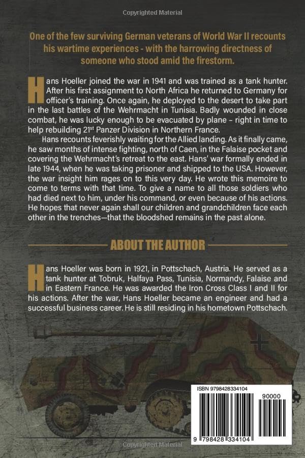 One of the last German veterans of World War II recounts his wartime experiences – with the harrowing directness of someone who stood amid the firestorm. Hans Hoeller joined the war in 1941 and was trained as a tank hunter. After his first assignment to North Africa he returned to Germany for officer’s training. Once again, he deployed to the desert to take part in the last battles of the Wehrmacht in Tunisia. Badly wounded in close combat, he was lucky enough to be evacuated by plane – right in time to help rebuilding 21st Panzer Division in Northern France. Hans recounts feverishly waiting for the Allied landing. As it finally came, he saw months of intense fighting, north of Caen, in the Falaise pocket and covering the Wehrmacht`s retreat to the east. Hans` war formally ended in late 1944, when he was taking prisoner and shipped to the USA. However, the war insight him rages on to this very day. He wrote this memoire to come to terms with that time. To give a name to all those soldiers who had died next to him, under his command, or even because of his actions. He hopes that never again shall our children and grandchildren face each other in the trenches – that the bloodshed remains in the past alone. What awaits the reader: Never will I forget how my father came home time and again, feeling so ashamed and desperate he did not have the heart to tell my mother that he had lost yet another job. Of course, she would register and start crying. And me, the little nipper, would play around them, anxious to cheer them up. Back then I swore to myself that I would do anything to change these conditions when I grew up. What had landed on me were the mutilated remains of my sergeant. His right side was unrecognizable. Everywhere blood streamed out of his torn-up body. We had to move away if we wanted to survive. I looked around; we were no more than ten to twelve men. Without further thinking I drew my pistol and yelled “Assault, forward!” I was rudely awoken by somebody shaking my shoulder. I blinked and looked at my watch; it was just after midnight on 6th June 1944. My trusted runner was standing at my bedside, reporting in a low voice, “Lieutenant, sir, enemy paratroopers have landed along the coast forward of our location.” So, this was it, I thought. The enemy had finally set foot in Normandy. About the author Hans Hoeller was born in 1921, in Pottschach, Austria. He served as a tank hunter at Tobruk, Halfaya Pass, Tunisia, Normandy, Falaise and in Eastern France. He was awarded the Iron CrossClass I and II for his actions. After the war, Hans Hoeller became an engineer and had a successful business career.
