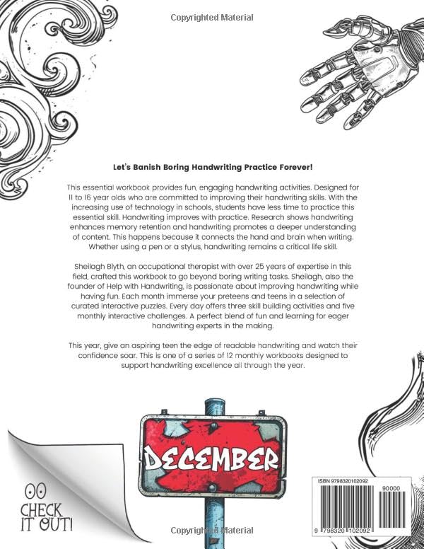 “The students feel they are in control of their own improvement.” Mrs Patterson, Senco at The Chalk Hills Academy, Shared Learning Trust. “This handwriting resource has provided us with another tool in helping our pupils progress. Staff have provided positive feedback on the activities. We have enjoyed using them in both whole class and 1 to 1 sessions,” Sotiria Vlahodimou, Headteacher at Slindon College. “He has already done his writing for the day before I ask him, it’s amazing seeing him take responsibility for improving his writing himself.” Parent. “This has made a very positive impact on my writing because most people can actually read it now”. Cory, student. Daily Writing, Lifelong Impact: Empower Teens to Have Fabulous Handwriting Want your teen to end the year with handwriting that stands out? As the year winds down, give your teen’s handwriting skills a festive boost with our December writing exercises. This workbook helps fix common trouble spots. It will improve your teen’s writing to look neat and ready for the next year. It does so through engaging prompts, mazes, brain teasers and more. Works with any handwriting style. Designed by an occupational therapist, it uses evidence-based methods. Focusing on skills of legibility, fluency, and fine motor control. The activities are suitable for printed, cursive or joined-up letter styles. The workbook includes: Daily writing prompts incorporating fun historical facts that match the calendar. Quests, mazes, brain teasers to add variety and engagement. Designed by an Occupational Therapist with proven methods used by hundreds of students. Reflection questions encourage motivation and growth. Students need only 10 to 15 minutes a day No prep required! In an increasingly paperless world, handwriting remains an essential skill. It is closely tied to academic success and cognitive development. Studies suggest that up to 27% of school aged children experience handwriting difficulties. Less reported is how hard it is to form letters or keep up in class. This can affect a student’s self-confidence. The challenges and content have been developed with real student input from teens striving to improve their handwriting. The workbook can be used individually or with a group of students. It uses best practice methods to ensure a positive experience and improved handwriting. The exercises include warm-ups, activities, and reflections. It goes beyond repetitive drills. This workbook provides all the needed tools to improve a teen’s handwriting. The motivating prompts and skill-building exercises make practice painless and even fun for teens. It’s also easy to follow for parents, teachers, tutors, or teaching assistants. This makes it easy to encourage and facilitate teenagers to improve their handwriting in an engaging way. This December workbook is full of seasonal prompts. These festive writing exercises will keep your teen engaged and inspired. Join us in making December a month of handwriting joy and celebration. The December workbook is one of 12 workbooks that have been designed to use a day by day approach to handwriting improvement. Each book is unique and seamlessly incorporates daily historical facts but can be started at any point within the year. The full range of books extends throughout the year to continue to build skills and keep the momentum rolling. This workbook builds real handwriting skills while keeping students interested and challenged too. The activities focus on improvement through regular practice rather than criticism. Opportunities for self-reflection exist. It celebrates continuous improvement, building confidence and skills. Better Handwriting is Waiting – Grab your Workbook Today!