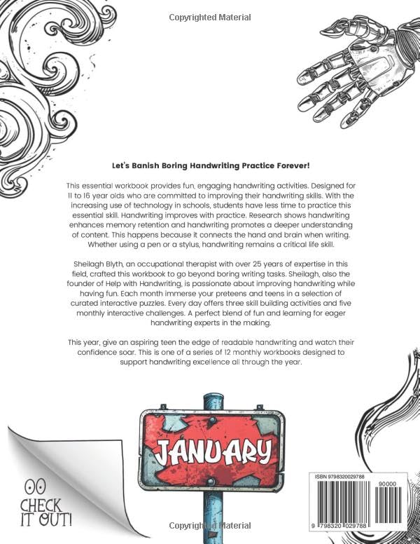 “The students feel they are in control of their own improvement.” Mrs Patterson, Senco at The Chalk Hills Academy, Shared Learning Trust. “This handwriting resource has provided us with another tool in helping our pupils progress. Staff have provided positive feedback on the activities. We have enjoyed using them in both whole class and 1 to 1 sessions,” Sotiria Vlahodimou, Headteacher at Slindon College. “He has already done his writing for the day before I ask him, it’s amazing seeing him take responsibility for improving his writing himself.” Parent. “This has made a very positive impact on my writing because most people can actually read it now”. Cory, student. Handwriting for the TikTok Generation: Quick, Fun Practice Do you know a teen whose handwriting is a challenge for both of you? Kick off this January with a handwriting practice workbook designed to help teens enhance their writing skills. It does so through engaging prompts, mazes, brain teasers and more. It has been created to support any handwriting style. Focusing on skills of legibility, fluency, and fine motor control. The activities are suitable for printed, cursive or joined-up letter styles. The workbook includes: Daily writing prompts incorporating fun historical facts that match the calendar. Quests, mazes, brain teasers to add variety and engagement. Designed by an Occupational Therapist with proven methods used by hundreds of students. Reflection questions encourage motivation and growth. Students need only 10 to 15 minutes a day. Used by students, teaching staff and parents No prep required! In an increasingly paperless world, handwriting remains an essential skill. It is tied to academic success and cognitive development. Studies suggest that up to 27% of school aged children experience handwriting difficulties. What is less reported is how difficulty forming letters or keeping up in class affects a student’s self-confidence. The challenges and content have been developed with real student input from teens striving to improve their handwriting. The workbook can be used individually or with a group of students. It uses best practice methods to ensure a positive experience and improved penmanship. The exercises include warm-ups, activities and reflections. It goes beyond repetitive drills. This workbook provides all the needed tools to improve a teen’s handwriting. The motivating prompts and skill-building exercises make practice painless and even fun for teens. It’s also easy to follow for parents, teachers, tutors, or teaching assistants. This makes it easy to encourage and facilitate teenagers to improve their handwriting in an engaging way. Let’s begin the New Year with a fresh start and a renewed approach to improving handwriting. It’s the perfect way to embrace the spirit of new beginnings and set a positive tone for the year ahead. The January workbook is one of 12 workbooks that have been designed to use a day by day approach to handwriting improvement. Each book is unique and seamlessly incorporates daily historical facts but can be started at any point within the year. The full range of books extends throughout the year to continue to build skills and keep the momentum rolling. This workbook builds real handwriting skills while keeping students interested and challenged too. The activities focus on improvement through regular practice rather than criticism. There are opportunities for self-reflection and it celebrates continuous improvement building up confidence alongside skills. Grab Your Copy Today and Watch Handwriting Improve!