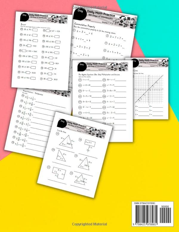 The Daily Math Practice Workbook includes essential topics for Grade 7 to build math skills required in today’s competitive world. Mathematics is a very vast subject; therefore, there is a continuous need to practice important concepts, methods, and terms in order to demonstrate and use these skills in daily life for problem solving and critical thinking. This book contains 180 workbooks consisting of all the major topics in the Grade. The workbooks are carefully designed in a way that as a student progress, the difficulty increases in order to gradually and completely master the math skills. And soon, a time comes when students feel fully confident in a particular math topic. Moreover, the teachers as well as parents want to assess the kids. Keeping that in view, we have designed this book in a way that each worksheet could be graded. You have the opportunity to decide your own scoring mechanism, i.e. 10/10, 20/20. Lastly, you can use this book in classroom for daily math activity, math practice, and math challenge or even for homework, with or without a reward for the top students. This book can also be used in home tuition by teachers and parents for daily 20 to 30 minutes’ Math Time. This book is also best for self-study and practice for exams. We have provided the solutions for each worksheet in the back of the book to confirm the solution or check what the solution could be if it is taking too much time. The Book Contains the following Skills: Adding and Subtracting Integers Expressions: Single Step Solving Equations Pre-Algebra Equation (One Step) Addition and Subtraction Pre-Algebra Equation (One Step) Multiplication and Division Pre-Algebra Equation: Two Sides Simplifying Expressions Simplifying Fractions Fractions: Multiple Operations Mean, Median, Mode and Range Commutative Property Associative Property Distributive Property Percent Percent: Advanced Ratio Conversion Classify and Measure Angles Area and Perimeter Volume and Surface Area Area and Circumference of Circle Cartesian Coordinates with Four Quadrants Answer Keys