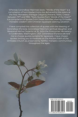 Whereas Gerondissa’s book, “Words of the Heart” is a compilation of homilies/sermons she delivered to the sisters at the Holy Monastery Panagia Odigitria, Protaria, Volos, Greece between 1971 and 1992 during her service as Reverend Mother Superior, “Daily Quotes from ‘Words of the Heart'” is a compilation of quotes from these homilies; sharing Orthodox monastic wisdom with Christian laypeople seeking salvation. I have compiled this collection of quotes with the blessing of Gerondissa Efpraxia, Gerondissa Makrina’s spiritual daughter and Reverend Mother Superior at St. John the Forerunner Monastery in Goldendale, Washington, USA. Gerondissa Efpraxia instructed me to choose quotes suitable for laypeople. Being mindful of her instructions, I have chosen quotes inviting you the reader to meditate on the Ancient Faith of the Orthodox Church as preserved by our faithful monastic communities throughout the ages. My personal connection with this fruitful branch of Orthodox Monastic Christianity began when Gerondissa Efpraxia and two other sisters arrived from Greece to start St. John the Forerunner Greek Orthodox Monastery in Goldendale, Washington. I lived only 70 miles away, in Yakima, with my young family.The first time we visited the fledgling monastery, the three founders prepared lunch for us. I was overwhelmed by their humble hospitality and cried my first tears of compunction, feeling my unworthiness of being served by these holy souls.For more than 20 years I have visited Gerondissa Efpraxia and the monastery, asking and receiving her guidance for my life. I will share with you a few personal instructions she gave me along the way:*Pray for my children every night: 2 prayer ropes “Lord, enlighten your servants.”*Thank God daily for your illness*Do morning prayers and vespers*Read my Bible daily*Moving near the church would be good* Attend Divine services*Give when you can, but if you can’t afford it, don’tOver the years the monastery of St. John the Forerunner has grow. Now, there are many sisters, new buildings including a beautiful church; several buildings for work, a shop, a guesthouse, and even a small cemetery.Join me in gleaning good fruit from this Holy branch of the Eastern Orthodox Church. We are living our Christian Faith “in the world” and God has not abandoned us. He has sent Gerondissa Makrina’s voice of monastic wisdom to teach us how to love our Lord Jesus Christ with all our heart, our mind, and our soul, and our neighbor as ourselves.