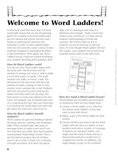 Students climb to new heights in reading and writing with these fun, engaging, reproducible word-building games! Students read clues on each rung, then change and rearrange letters to create words until they reach the top. All the while, they’re analyzing sound-symbol relationships, broadening their vocabulary, and building spelling skills to become better readers.