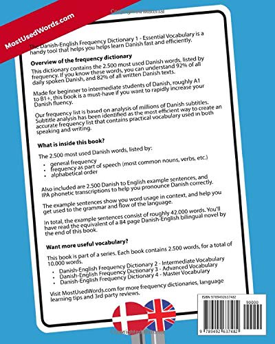The Core Vocabulary of Danish With this book, you will learn Danish fast and efficiently. This book contains practical vocabulary for both spoken and written Danish. Intended for beginners and intermediate students, this book covers vocabulary roughly from CEFR A1 (complete beginner) to B1 (somewhat able). To help you become fluent fast, each entry in this book contains * English translation(s) * Danish to English example sentences * IPA phonetic spelling * Detailed Part of Speech information Why Study By Frequency?: Not all words are created equal. Some words are used more than others, and are thus more valuable to know. The secret to becoming fluent fast in a language, is by learning the right vocabulary. Studies have shown that the most used 2.500 words account for 92% of all spoken Danish, and 82% of all written Danish text. How Much Vocabulary Do You Need To Know? While it’s important to note it’s impossible to pin down these numbers and statistics with 100% accuracy, these are a global average of multiple sources. According to scientific research, this is the amount of vocabulary needed for varying levels of fluency: * 250 words: the essential core of a language. Without these words, you cannot construct sentences. * 750 words: those that are used every single day by every person who speaks the language. * 2,500 words: those that should enable you to express everything you could possibly want to say, although some creativity might be required. * 5,000 words: the active vocabulary of native speakers without higher education. You will understand about 90% of all written text. * 10,000 words: the active vocabulary of native speakers with higher education. * 20,000 words: the amount you need to recognize passively in order to read, understand, and enjoy a work of literature such as a novel by a notable author. Keeping above facts in mind, the value of a frequency dictionary is immense. At least, if you want to become fluent in a language fast. Study the most frequent words, build your vocabulary and progress naturally. What is Inside This Book? A frequency word list of the most frequently used Danish words, based on analysis of a large collection of Danish subtitles. A large base text collection is absolutely vital in order to establish a reliable general frequency list. Subtitles have the advantage of corresponding both to written and spoken language. This makes subtitles the best method for creating a useful and practical word frequency list. This Danish to English frequency dictionary can roughly be divided in three parts. * 2.500 Danish words in ranked by general frequency * Frequency ranking by part of speech (E.G, the most used adjectives, nouns, verbs, etc) * 2.500 Danish words in alphabetical order Danish pronunciation can be tricky. To help you pronounce Danish words correctly, we added phonetic transcriptions of Danish words. We use the International Phonetic alphabet for phonetic spelling of Danish words. Summary The Danish Frequency Dictionary – Essential Vocabulary gives you a practical word list to learn Danish vocabulary. Study the most used words to rapidly gain a base vocabulary in Danish. These high-frequency words are a great tool for beginners and intermediate students. The frequency dictionary can be used as a stand-alone tool, or in combination with any other language learning program, app or book. This book roughly covers CEFR vocabulary ratings from A1 (absolute beginner) to B1 (somewhat proficient). Invest this book, and invest in yourself. You will amaze yourself, your friends and your family by how fast you’re progressing in your journey of speaking Danish.