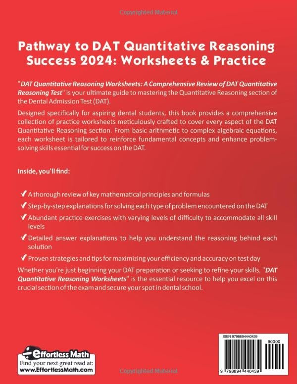 Master DAT Math: From Basic to Advanced, A Complete 2024 Guide Embark on a transformative journey towards mastering the DAT Quantitative Reasoning Test with the meticulously crafted “DAT Quantitative Reasoning Worksheets 2024.” This authoritative guide is tailored to echo the 2024 course guidelines, offering a structured pathway to excel in every quantitative aspect of the DAT. Elevate Your DAT Prep with Precision-Engineered Content From the fundamentals to the most challenging topics, this book provides an exhaustive analysis and practice that replicates the real DAT environment. Every concept is elucidated with clarity and complemented by high-quality worksheets that challenge your understanding and application skills. Key Features: Alignment with 2024 Course Guidelines: Ensures up-to-date material that reflects the latest exam pattern and syllabus. Integrated Learning Experience: An accompanying online course mirrors the book’s content, providing a seamless learning experience. Interactive QR Codes: Each page features a QR code linking to additional resources like practice problems, video tutorials, and extended examples, creating a dynamic study environment. Comprehensive Answer Keys: Answers for all questions help clarify doubts and reinforce learning. Full-Length Practice Tests: Includes two complete practice tests with detailed solutions, simulating the actual exam experience and preparing you for every potential challenge. Transformational Learning Tools at Your Fingertips The integration of QR codes transforms each page into a gateway to deeper understanding. Whether you need a quick refresher, extended practice, or an interactive lesson, these codes connect you instantly to a wealth of resources designed to enhance your learning. Build Confidence, Achieve Mastery With each page, witness your confidence grow as you gain mastery over complex quantitative problems. The detailed answers and insights from practice tests provide you with the tools to analyze your performance and continually improve. Ideal for self-study and classroom usage!