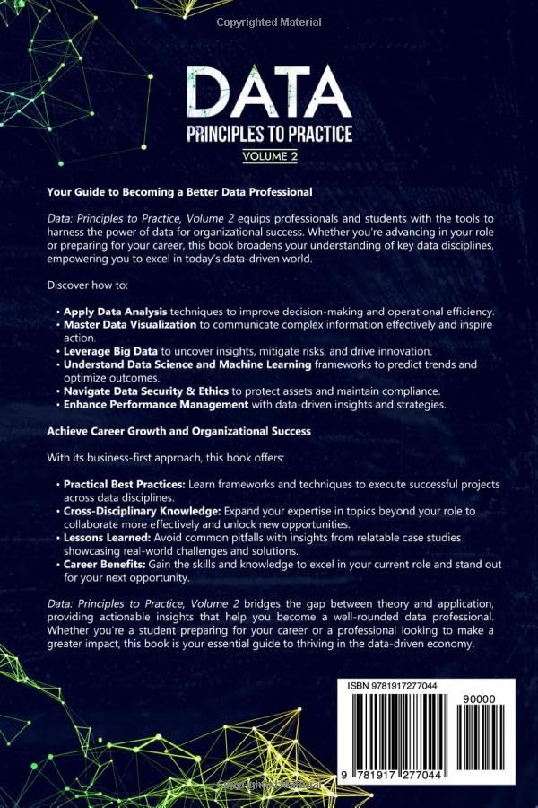 Master Data-Driven Strategies for Business Success In an era where data drives competitive advantage, understanding how to leverage it effectively is crucial for every business leader, manager, and professional. Data: Principles to Practice Volume II: Analysis, Insight & Ethics offers a practical, non-technical guide to navigating the complexities of modern data practices and applying them to real-world business challenges. This second volume in the acclaimed Data: Principles to Practice series focuses on helping readers move beyond theory, equipping them to make smarter decisions and unlock strategic value from data across their organization. What you’ll learn: Harness Big Data and Advanced Analytics for Real-World Impact: Learn how leading companies extract actionable insights from massive datasets to gain a competitive edge. Leverage Data Science and Machine Learning Without the Jargon: Understand key concepts, workflows, and applications that can drive innovation and improve business outcomes, all explained in clear, accessible language. Transform Information into Action with Data Visualization: Discover best practices for turning complex data into compelling visual narratives that support informed decision-making at every level. Optimize Performance Management Using Data-Driven Techniques: Find out how to align KPIs with business objectives and use real-time insights to boost operational efficiency. Navigate the Complex World of Data Security and Ethics: Gain insight into safeguarding sensitive data, ensuring transparency, and fostering trust in an increasingly data-reliant world. Featuring engaging case studies, actionable insights, and proven strategies, this volume is tailored for professionals who want to improve their understanding of data’s role in driving business success–without getting lost in technical details. Whether you’re an executive aiming to develop a data-driven strategy, a manager looking to optimize performance, or a professional seeking to enhance your data literacy, this book is your guide to turning data into business value. Take the first step toward data mastery. Click “Add To Basket” and get your copy of Data: Principles to Practice Volume II today!