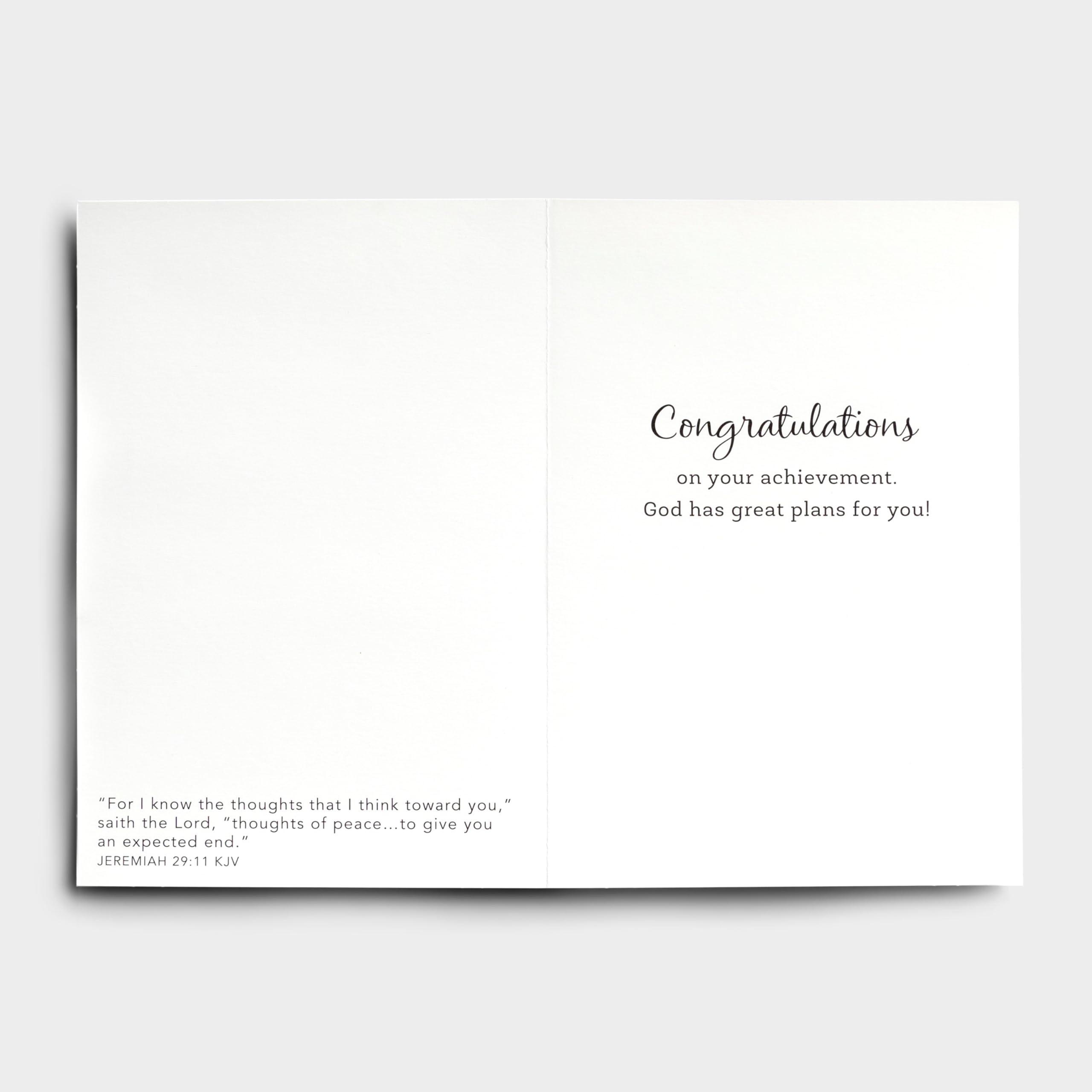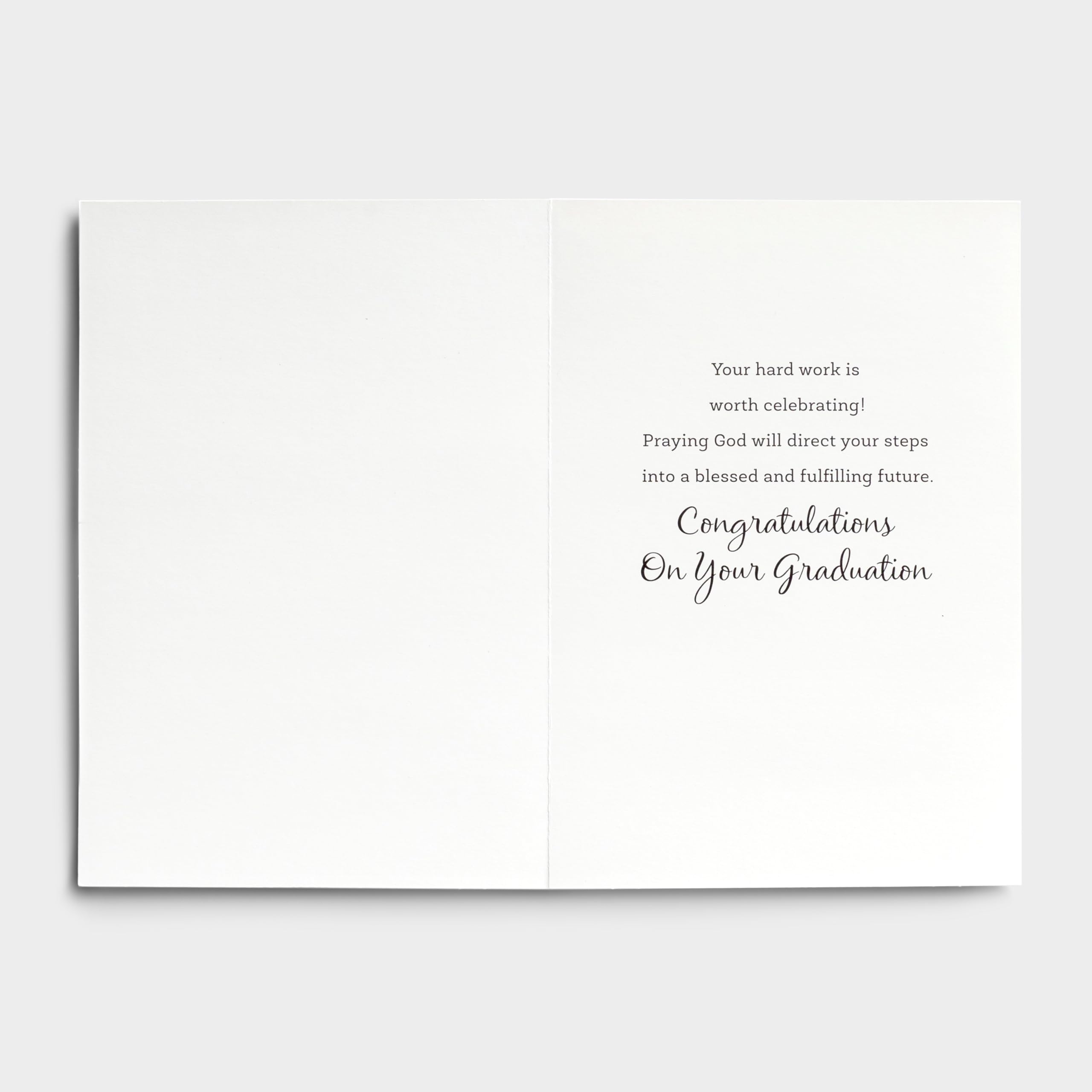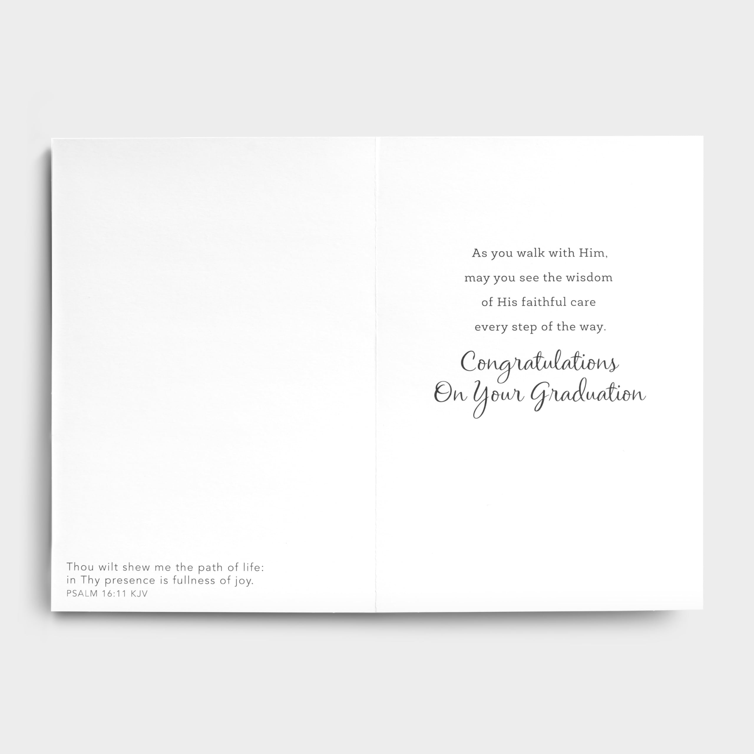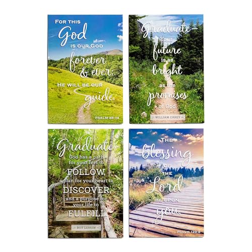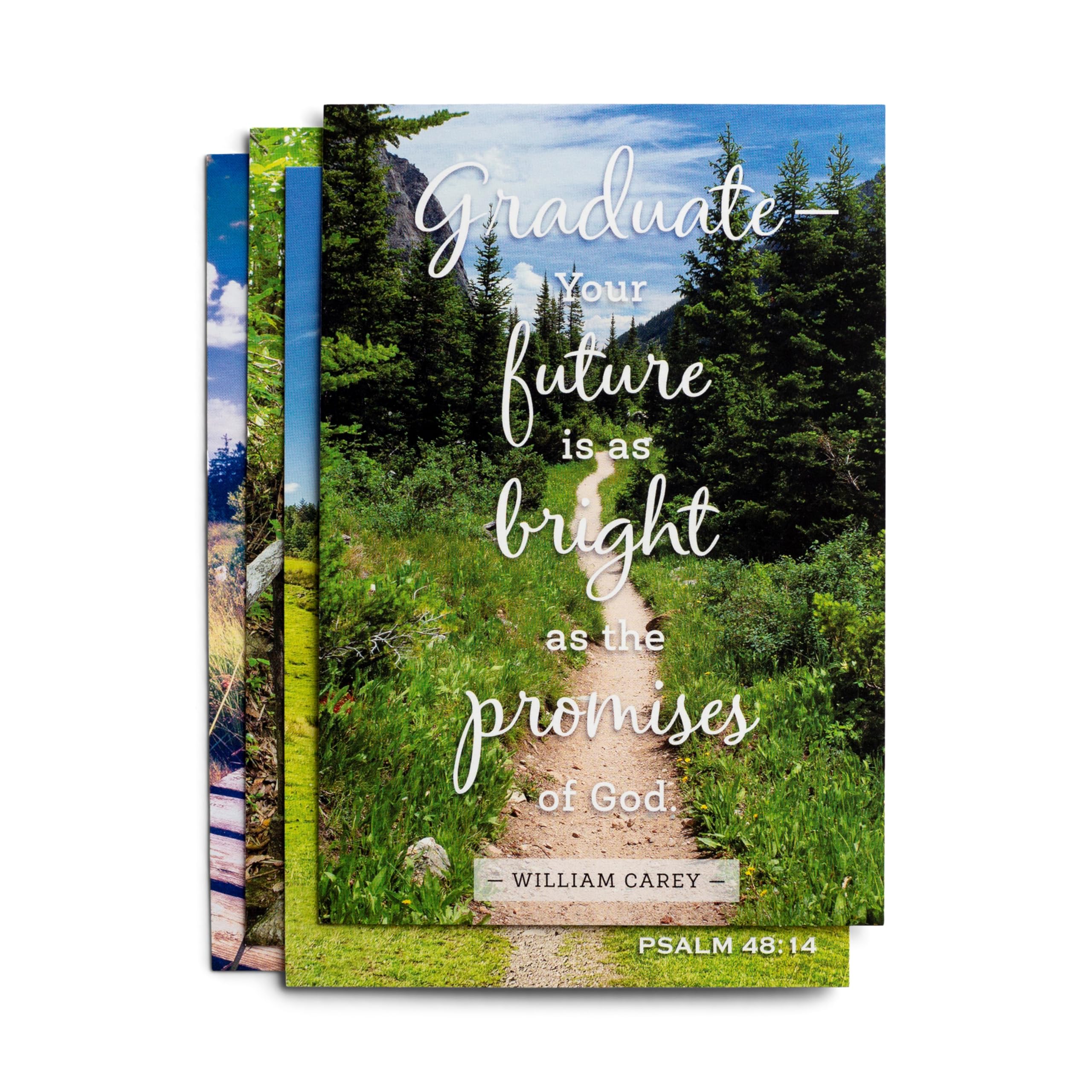 Congratulate your favorite graduates on their accomplishments and remind them of God’s promises for their bright future. Card 1 Front: Graduate Your Future is as Bright as the Promises of God – William Carey. Inside: Congratulations on your achievement. God has great plans for you! Scripture: For I know the thoughts that I think toward you, saith the Lord, thoughts of peace… to give you an expected end. Jeremiah 29:11 KJV. Card 2 Front: Graduate God has a path for your feet to follow, a plan for your heart to discover and a purpose for your life to fulfill. -Roy Lessin. Inside: Inside: As you walk with Him may you see the wisdom of His faithful care every step of the way. Congratulations on Your Graduation Scripture: Thou wilt shew me the path of life: in Thy presence is fullness of joy. Psalm 16:11 KJV Card 3 Front: The blessing of the Lord be upon you. Psalm 129:8. Inside: Your hard work is worth celebrating! Praying God will direct your steps into a blessed and fulfilling. Congratulations on Your Graduation. Card 4 Front: For this God is our God forever & ever: He will be our guide. Psalm 48:14 Inside: As you begin this exciting time in your life, a time of challenge and new experiences, may the Lord be with you as a constant source of strength, encouragement, and guidance. Congratulations on Your Graduation. Product Details Celebrate your college or high school graduates accomplishments and let them know how bright their future is 3 of each card in 4 different pathway nature designs Inspire your special graduate with hope and encouragement from KJV Scripture text as they embark on their new path