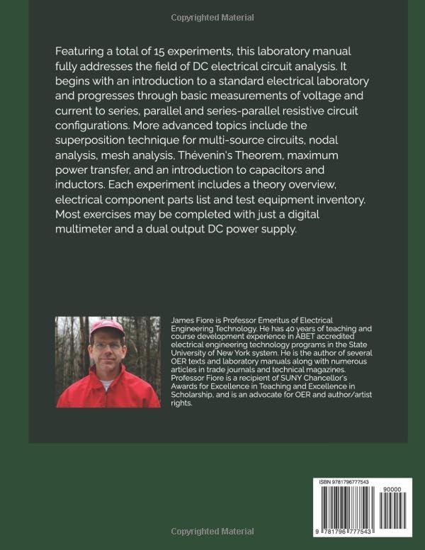 Featuring a total of 15 experiments, this laboratory manual fully addresses the field of DC electrical circuit analysis. It begins with an introduction to a standard electrical laboratory and progresses through basic measurements of voltage and current to series, parallel and series-parallel resistive circuit configurations. More advanced topics include the superposition technique for multi-source circuits, nodal analysis, mesh analysis, Thevenin’s Theorem, maximum power transfer, and an introduction to capacitors and inductors. Each experiment includes a theory overview, electrical component parts list and test equipment inventory. Most exercises may be completed with just a digital multimeter and a dual output DC power supply. This is the print version of the on-line OER. The current revision number and date are version 1.4.4, 13 October 2024.