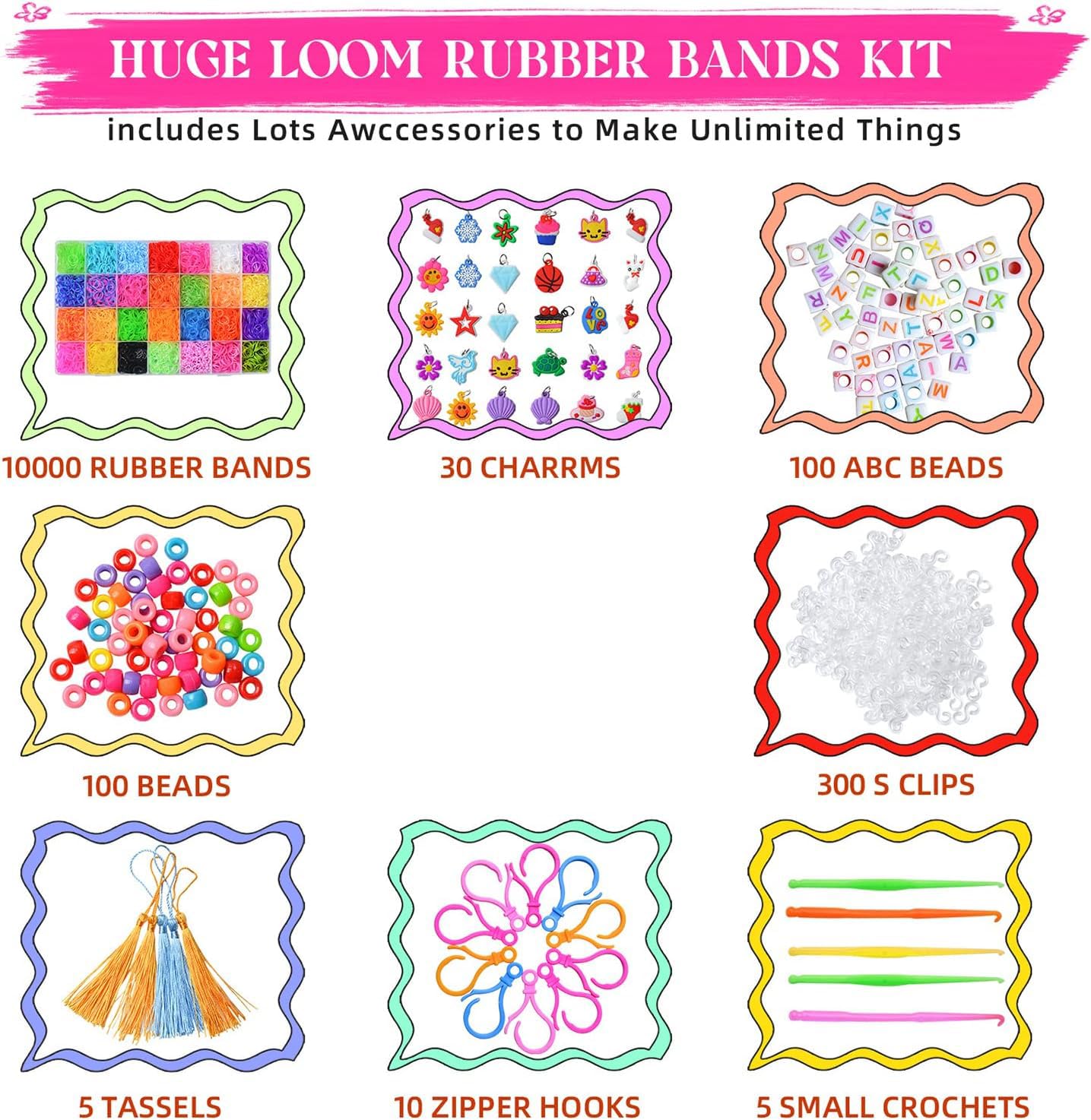 • . This rubber bands kit comes with all the necessary tools for DIY, including 10000+ loom bands, 300 S-Clips, 200 small horse beads, 200 Letter bead, 30 charms, 10 zipper hooks, 5 root crochets,5 tassels
