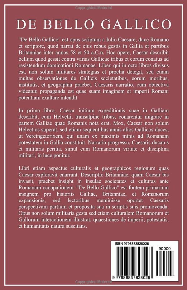 “De Bello Gallico” est opus scriptum a Iulio Caesare, duce Romano et scriptore, quod narrat de eius rebus gestis in Gallia et partibus Britanniae inter annos 58 et 50 a.C.n. Hoc opere, Caesar describit bellum quod gessit contra varias Gallicae tribus et eorum conatus ad resistendum dominationi Romanae. Liber, qui in octo libros divisus est, non solum militares strategias et proelia detegit, sed etiam multas observationes de Gallicis societatibus, eorum moribus, institutis, et geographia praebet. Caesaris narratio, cum obiectiva videatur, propaganda est quae suam imaginem et imperii Romani potentiam exaltare intendit. In primo libro, Caesar initium expeditionis suae in Galliam describit, cum Helvetii, transalpine tribus, conarentur migrare in partem Galliae quae Romanis nota erat. Mox, Caesar non solum Helvetios superat, sed etiam sequentibus annis alios Gallicos duces, ut Vercingetorixem, qui unam ex maximis minis ad Romanam potestatem in Gallia constituit. Narratio progressu, Caesaris ducatus et militaris peritia, simul cum Romanorum virtute et disciplina militari, in luce ponitur. Libri etiam aspectus culturalis et geographicos regionum quas Caesar exploravit enarrant. Descriptio Britanniae, quam Caesar bis invasit, praebet insight in insulae societates et culturas ante Romanam occupationem. “De Bello Gallico” est fontem primarium insignem pro historiis Galliae, Britanniae, et Romanorum expansionis, sed lectoribus meminisse oportet Caesaris perspectivam partium et proposita sua in scriptis suis promovenda. Opus non solum militaria gesta sed etiam culturalem Romanorum et Gallorum interactionem illustrat, quaestiones de imperii, potestatis, et humanitatis natura suscitans.