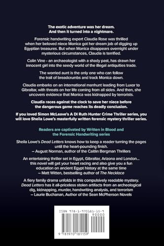 The exotic adventure was her dream. And then it turned into a nightmare. Forensic handwriting expert Claudia Rose was thrilled when her beloved niece Monica got her dream job of digging up Egyptian treasures. But when Monica disappears overnight under mysterious circumstances, Claudia is lost and terrified. Colin Vine – an archaeologist with a shady past, has drawn her innocent girl into the seedy world of the illegal antiquities trade. The worried aunt is the only one who can follow the trail of breadcrumbs and track Monica down. Claudia embarks on an international manhunt leading from Luxor to Gibraltar, with threats on her life coming from all sides. And then, she uncovers evidence that Monica got kidnapped by terrorists. Claudia must race against the clock to save her niece before the dangerous game reaches its deadly conclusion. If you loved Simon McLeave’s A DI Ruth Hunter Crime Thriller series, you would most certainly love Sheila Lowe’s masterfully written forensic mystery thriller series. Readers are thrilled with Sheila Lowe’s “Dead Letters!” “Make way, Hercule Poirot and Amanda Peabody, Claudia Rose is coming to Egypt…Loved it. Now I have to go back to the beginning and read all the other Claudia Rose mysteries.” — Goodreads Reviewer “What mystery includes so many twists and turns that will keep you guessing and wondering what will happen next? An intelligent, unique mystery–that incorporates graphology throughout as the mystery unfolds.” — Goodreads Reviewer “Dead Letters took me out of my armchair straight to Egypt and then around the globe…I was mesmerized as one clue led to another, always meandering through exotic cities.” — Goodreads Reviewer “Wow, what a ride!! This is a gripping mystery set mostly in Egypt and Gibraltar…The ending will have you on the edge of your seat but, quite frankly, so will the rest of the book.” — Goodreads Reviewer “I could taste the dusty Egyptian air! Take an adventure ride with this action packed forensic mystery/suspense novel…She brings you so close that you’ll have to wipe the desert sand from your shoes! This is my first Claudia Rose Book and I’m hooked!” — Goodreads Reviewer
