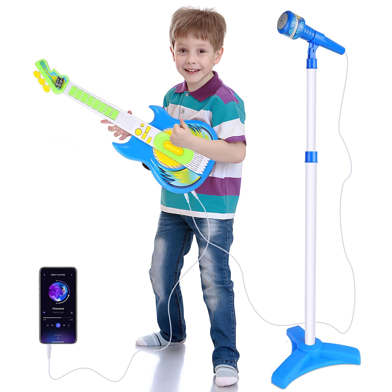 - Multifunction Music Toy Guitar:Microphone stand requires the telescopic rod and base to be assembled features an adjustable height range from 19.6 to 36.6 inches, and 180deg rotatable mic clip offers effortless angle adjustments, allowing kids to ensures perfect microphone positioning every time. Have the kids carry toy guitars, connect the media cable with iphone,MP3 or ipods, and press the on/off key lets children enjoy any of the 8 demo songs bar and pretend they’re actually strumming the strings on them.