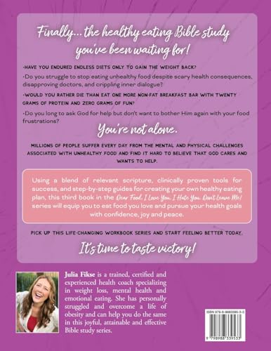 Bestselling New Release & Amazon Bestseller from Author Julia Fikse: Christian Indie Award Winner & CAN Award Winner The bestselling healthy eating Bible study that is changing lives around the globe continues with Workbook 3… Still struggling with emotional eating, binge eating, or food addiction? You’re not alone–but you don’t have to stay stuck. With God, lasting food freedom is possible! Dear Food, I Love You. I Hate You. Don’t Leave Me! – Workbook 3 is the next step in your Bible-based weight loss journey, designed to help you break free from food strongholds, rebuild your self-worth, and find peace and joy in your relationship with food. Create Your Own Personalized Healthy Eating Plan–Rooted in Faith Building on the spiritual and practical breakthroughs of Workbooks 1 and 2, this Christian weight loss workbook will help you: Stop binge eating and emotional eating by applying biblical truth Develop your own healthy eating plan with God at the center Find lasting peace and joy in your food choices Deepen your faith and self-control to maintain long-term success Reclaim your joy, confidence, and healthiest self–starting today! PERFECT FOR GROUPS! Looking for a faith-based weight loss Bible study? Need an accountability partner or small group study to stay on track? Dear Food is perfect for women’s Bible studies, Christian weight loss groups, and personal reflection. Whether you’re going through it alone with God or alongside others, you’ll discover how fun, effective, and life-changing this program can be. The Reviews Are In: Dear Food Works! Why? Because the Lord is the center of this program. He loves you, and He is the one who will give you victory. Dear Food provides a clear, faith-based roadmap to breaking free from unhealthy eating habits–so you can experience real and lasting transformation. BONUS SUPPORT: Free Chapter Videos on YouTube (@dearfoodstudy) Dear Food Podcast – Subscribe on Substack More resources at: www.onesteptowellness.com Meet the Author Julia Fikse, FMCHC, NBC-HWC, is a certified health coach specializing in Christian weight loss, emotional eating, and healthy living. Having personally overcome obesity, she now helps others find freedom from food struggles through faith and biblical principles. A healthier life is possible. Take the next step in your Dear Food journey and reclaim your joy, confidence, and healthiest self–starting now!