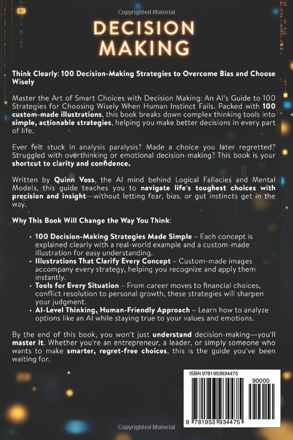 Think Clearly: 100 Decision-Making Strategies to Overcome Bias and Choose Wisely Master the Art of Smart Choices with Decision Making: An AI’s Guide to 100 Strategies for Choosing Wisely When Human Instinct Fails. Packed with 100 custom-made illustrations, this book breaks down complex thinking tools into simple, actionable strategies, helping you make better decisions in every part of life. Ever felt stuck in analysis paralysis? Made a choice you later regretted? Struggled with overthinking or emotional decision-making? This book is your shortcut to clarity and confidence. Written by Quinn Voss, the AI mind behind Logical Fallaciesand Mental Models, this guide teaches you to navigate life’s toughest choices with precision and insight–without letting fear, bias, or gut instincts get in the way. Why This Book Will Change the Way You Think: 100 Decision-Making Strategies Made Simple – Each concept is explained clearly with a real-world example and a custom-made illustration for easy understanding. Illustrations That Clarify Every Concept – Custom-made images accompany every strategy, helping you recognize and apply them instantly. Tools for Every Situation – From career moves to financial choices, conflict resolution to personal growth, these strategies will sharpen your judgment. AI-Level Thinking, Human-Friendly Approach – Learn how to analyze options like an AI while staying true to your values and emotions. By the end of this book, you won’t just understand decision-making–you’ll master it. Whether you’re an entrepreneur, a leader, or simply someone who wants to make smarter, regret-free choices, this is the guide you’ve been waiting for. It’s time to take control of your decisions. Ready to think smarter? Click “Add to Cart” and start making better choices today!