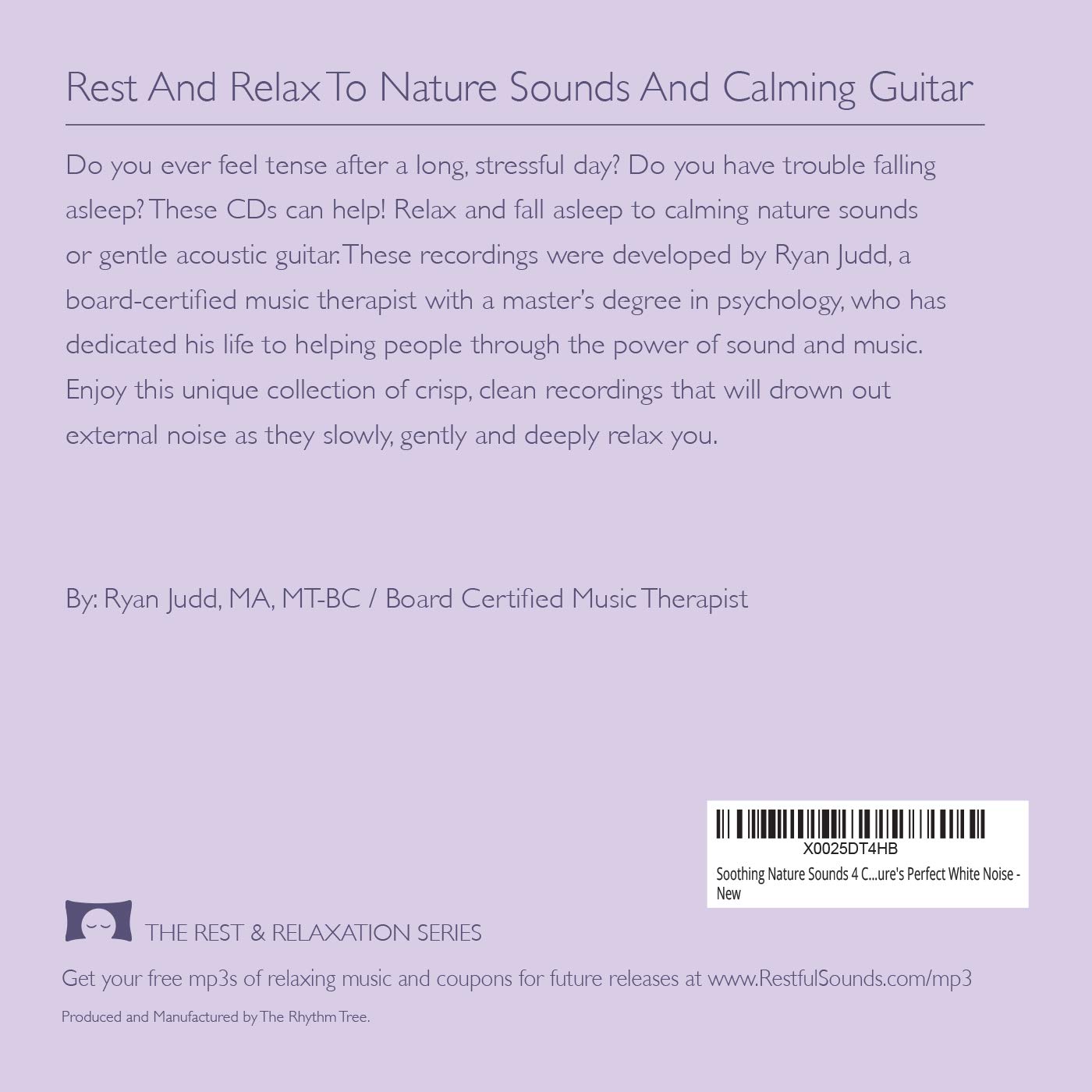 Relax, De-stress Or Fall Asleep To The Soothing Sounds Of Nature Or Calming Guitar with Ocean Waves Feel tense after a long, stressful day? Do you have trouble falling asleep and staying asleep? Be swept away to a peaceful place with the Deep Relaxation 4 CD Set. Your passport to natural relaxation and sleep. The ONLY nature and soothing guitar CDs created by a music therapist specializing in the use of sound and music to help reduce anxiety, stress and insomnia. These premium-quality CDs are great for creating white noise to drown out external sounds as they slowly, gently relax you. You’ll feel peace and calm wash over you as tension and stress drain away. You’ll drift into restful sleep. Plus, you’ll wake up refreshed next morning – without that groggy feeling you’d get with sleeping meds. Your CDs provide: – Over 3 hours of real nature recordings plus 1 hour of soothing guitar music without distracting sounds, annoying loops, or guided relaxations (talking) – Professional recording quality for crisp, clean audio sound that is not looped so you can enjoy these continuous recordings. – Gift quality premium packaging – 6-month guarantee: If you don’t love these relaxing CDs, return them within 6 months of delivery for a full refund Plus – A percentage of profits are donated to Lucy’s Love Bus, a non-profit organization that provides free music therapy services to pediatric cancer patients in New England. What won’t you get? Distractions! Your CDs have no jarring background noises, or distracting sounds. These are professional, high-quality CDs NOT made in China and unlike cheaper CDs, these will work in all CD players, guaranteed! Add to cart now If you love the sounds of nature – or if you simply crave peace and calm – order this CD set right away. Plus, get some as gifts for friends and family who have trouble relaxing or sleeping. Can’t wait for your CDs to arrive? Download them now!