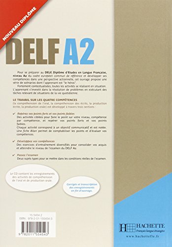 Pour se preparer au DELF, Diplome d’etudes en Langue Francaise, niveau A2 du CECRL et developper ses competences dans une perspective actionnelle, cet ouvrage propose une serie de scenarios dont l’apprenant est ‘le heros’. Fortement contextualisees, toutes les activites se realisent en situation. L’apprenant s’investit dans la resolution de problemes en executant des taches relevant de situations de la vie quotidienne. Travailler sur les quatre competences- la comprehension de l’oral – la comprehension des ecrits – la production ecrite – la production orale a travers trois phases – reperez vos points forts et vos points faibles – developpez vos competences – passez l’examen avec un CD encarte qui contient les enregistrements des activites de comprehension de l’oral et de production oral et, en annexe, des corriges et transcription des enregistrements.