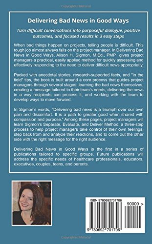 Why is delivering bad news hard to do? What are the tactics we use to avoid or postpone it? What can we do to get out of our own way so we can work the problem and get results faster? When bad things happen on projects, telling people is difficult. This tough job almost always falls on the project manager. In Delivering Bad News in Good Ways, Alison H. Sigmon, M.Ed., PMP gives project managers a practical, easily applied method for quickly assessing and effectively responding to the need to deliver difficult news appropriately. Packed with anecdotal stories, research-supported facts, and “in the field” tips, the book is built around a core process that guides project managers through several stages: learning the bad news themselves, creating a message tailored to their team’s needs, delivering the news in a way recipients can process it, and working with the team to develop ways to move forward. In Sigmon’s words, “Delivering bad news is a triumph over our own pain and discomfort. It is a path to greater good when shared with compassion and purpose.” Among these pages, project managers will learn Sigmon’s Separate, Evaluate, and Deliver Method, a three-step process to help project managers take control of their own feelings, step back from and analyze their reactions, and to come out the other side with the right message for the right audience. Delivering Bad News in Good Ways for Projects is the first in a series of publications tailored to specific groups. Future publications will address the specific needs of healthcare professionals, educators, executives, couples, teens, and parents.