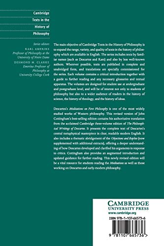 Descartes’s Meditations on First Philosophy remains one of the most widely studied works of Western philosophy. This volume is a refreshed and updated edition of John Cottingham’s bestselling 1996 edition, based on his translation in the acclaimed three-volume Cambridge edition of The Philosophical Writings of Descartes. It presents the complete text of Descartes’s central metaphysical masterpiece, the Meditations, in clear, readable modern English, and it offers the reader additional material in a thematic abridgement of the Objections and Replies, providing a deeper understanding of how Descartes developed and clarified his arguments in response to critics. Cottingham also provides an updated introduction, together with a substantially revised bibliography, taking into account recent literature and developments in Descartes studies. The volume will be a vital resource for students reading the Meditations, as well as those studying Descartes and early modern philosophy.